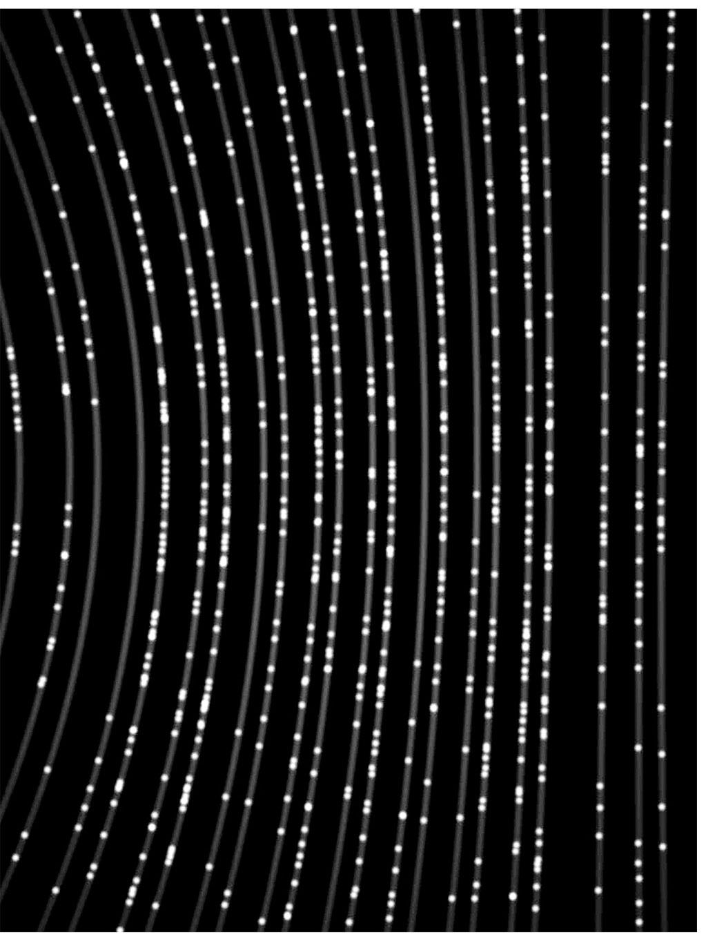 Полная калибровка гониометра. Набор рефлексов по всей площади детектора получен с использованием пяти ω-сканов в интервале ±30° от вычисленных значений w для рефлексов эталона Si: 00, 337, 22, 51, 0. Это позволило набрать кроме рефлексов, выводимых в отражающее положение для методики “Экватор”, суммарно еще около 1000 отражений. Обработку полученных фреймов проводили в пакетном режиме по программе SearchXY-2θ. В новой версии этой программы усовершенствована работа с “горячими” пикселями. Раньше пики, на профиль которых попадал такой пиксель, не участвовали в калибровке (отбраковывался программой). В текущем варианте программа присваивает пику рассчитанную среднюю интенсивность окружающих его восьми пикселей и далее работает с ним как с обычным отражением. Также в текущую версию добавлена функция для отбраковки рефлексов, не полностью вошедших в интервал съемки: для каждой из проведенных дифракционных дуг программа рассчитывает максимальное значение интенсивности Imax и не учитывает рефлексы, интенсивность которых меньше некоторой доли Imax, задаваемой пользователем. В окончательном расчете были задействованы 794 рефлекса, расположенных на 22 дугах (при проведении калибровки использовали только Kα1-составляющие). Калибровочные дуги с наложенными на них рефлексами Si изображены на рис. 3. Среднее абсолютное отклонение экспериментальных дифракционных линий от уточненных положений теоретических дуг <|Δ2θ|> составило 0.005°. Критерий качества проведенной калибровки согласно [7] Qс = 176. Полученные характеристики положения детектора (согласно [18]): Poni1 = 518.58 пикс., Poni2 = 388.58 пикс. (координаты центра ортогональной проекции образца на плоскость детектора); D = 108.72 мм (расстояние от центра образца до точки Poni1,2); Rot1 = 69.93°, Rot2 = –0.43°, Rot3 = (2.61 × 10–8)° (углы наклона плоскости детектора).