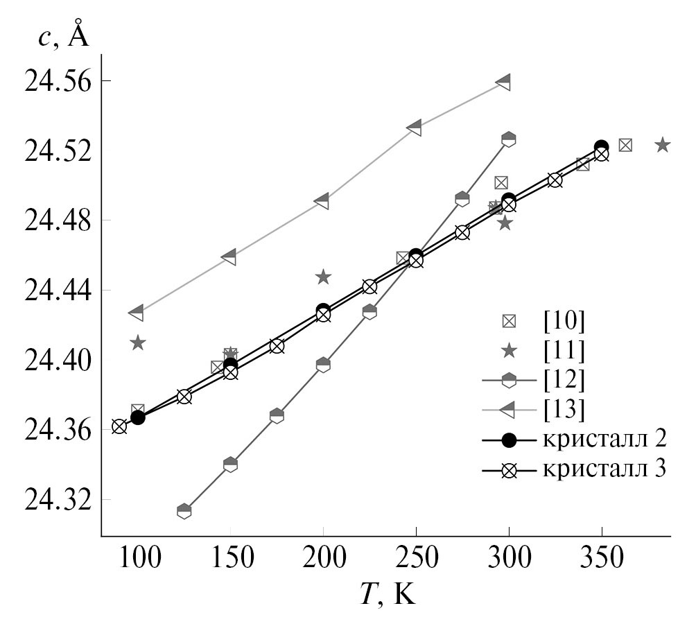 Температурные эксперименты. Результаты проведенных калибровок гониометра использовали при определении углов 2θ в ходе температурных экспериментов на кристаллах 2 и 3. Для кристалла 2 была изучена только зависимость с(Т) в интервале 100–350 К. Результаты изменения с(Т) представлены на рис. 5. Изменение всех трех параметров ромбической элементарной ячейки кристалла 3 изучено в интервале 90–350 К (табл. 2, рис. 4). Результаты представлены на рис. 5 в сравнении с литературными данными.