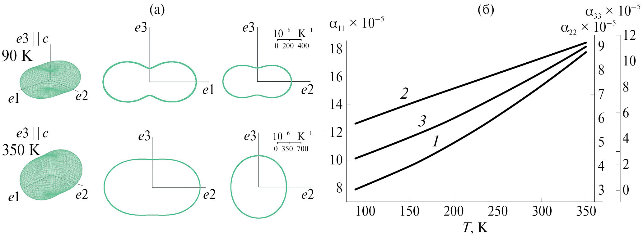 Рис. 6. Вид тензора теплового расширения α-S (а) и зависимость его элементов α11 (1), α22 (2), α33 (3) от температуры (б).