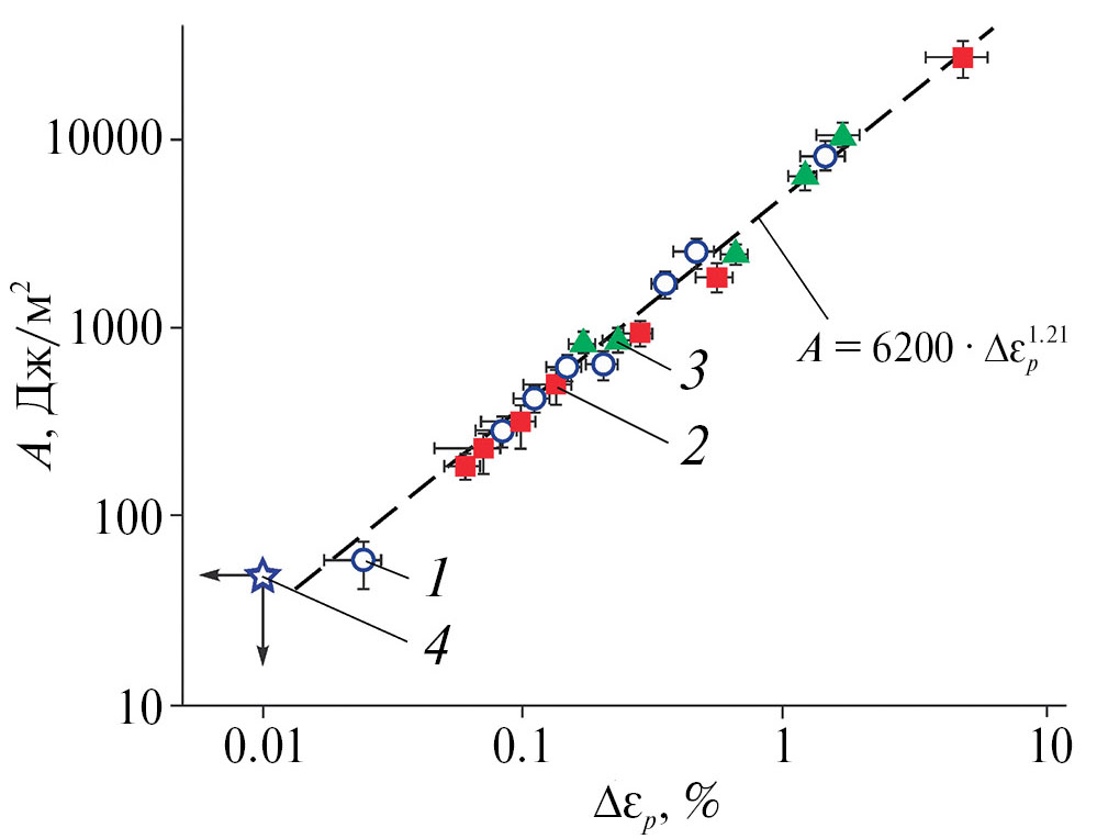 При Δεp ≥ 0.03% в двойных логарифмических координатах наблюдалась линейная зависимость между А и Δεp (рис. 4) с коэффициентом наклона 6.2 ± 1.1 (кДж/м2)/% и показателем степени n = 1.21 ± 0.05. Показатель степени n > 1 означает, что рост работы происходил не только за счет увеличения пластичности, но и одновременного упрочнения.