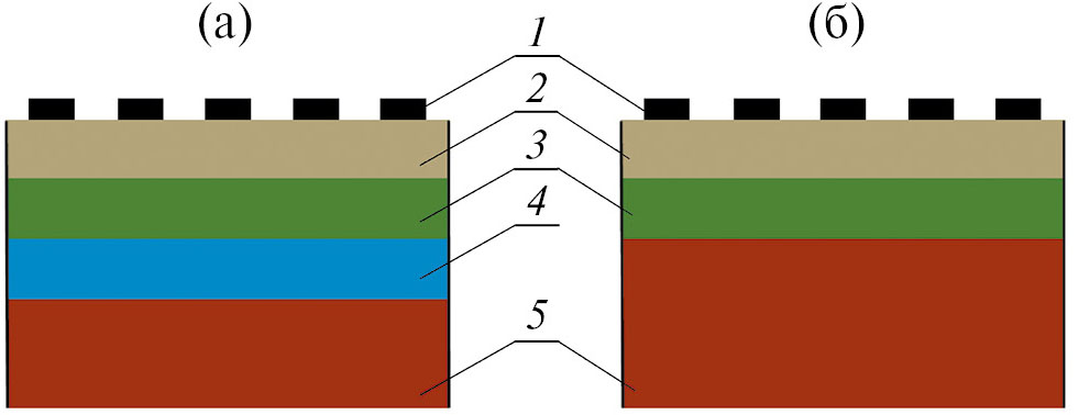 Рис. 1. Типовая I.H.P. ПАВ-структура: оригинальный трехслойный вариант (а) и модифицированный двухслойный вариант (б): 1 – электроды, 2 – пьезоэлектрический слой, 3 – функциональный слой (SiO2), 4 – низкоскоростной слой (AlN), 5 – основная подложка.