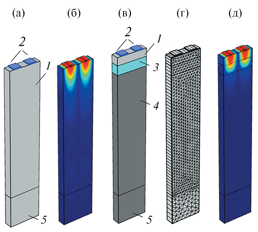 Рис. 2. Тестовые структуры: а – электроды с периодом p = λ/2 на монокристаллической подложке, б – картина механических смещений для одной из собственных частот на монокристаллической подложке, в – I.H.P.-структура, г – сетка, д – картина механических смещений для одной из собственных частот I.H.P.-структуры. Особенности модели: 1 – пьезоэлектрический материал, 2 –электроды, 3 – слой SiO2, 4 – слой Si, 5 – идеально согласующий слой.