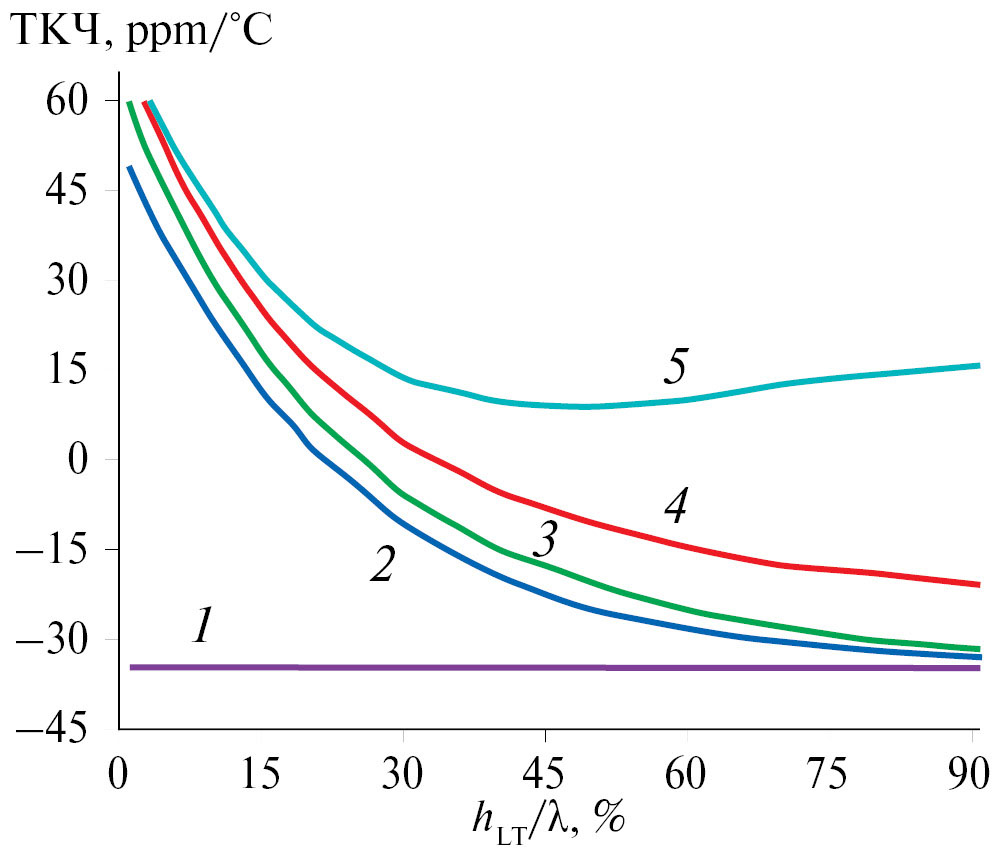 Рис. 4. Зависимость ТКЧ в I.H.P.-структуре от относительной толщины пьезоэлектрического слоя (hLT) при различных толщинах пленки SiO2 (hSiO2): 1 – ТКЧ традиционной подложки танталата лития 36°YX-среза, 2 – hSiO2/λ = 30, 3 – hSiO2/λ = 50, 4 – hSiO2/λ = 75, 5 – hSiO2/λ = 100%.