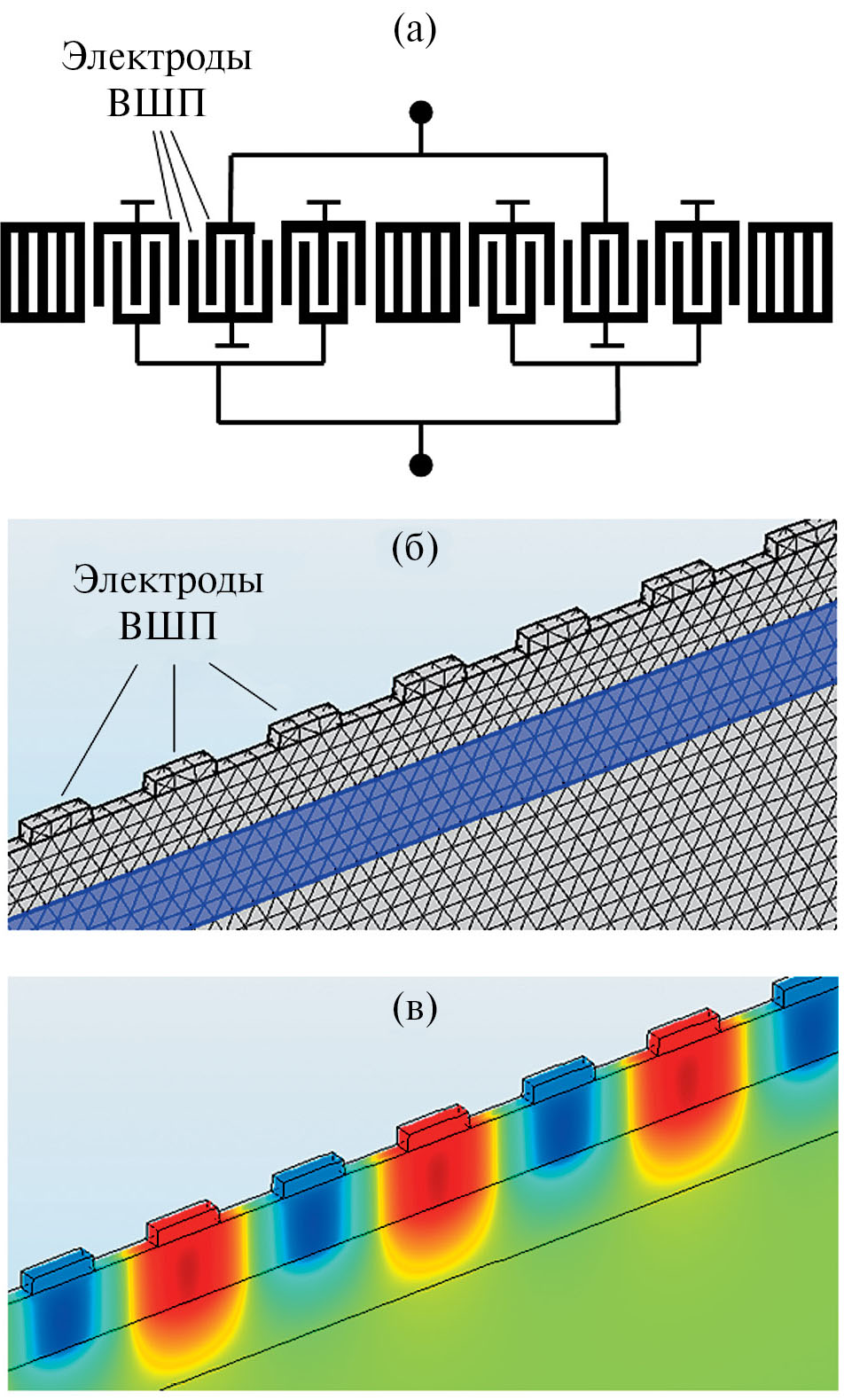 В качестве тестовых структур в работе рассмотрены фрагменты ВШП размером в одну длину волны с алюминиевыми электродами (ширина электродов ВШП – λ/4), расположенного на монокристаллической подложке танталата лития, и I.H.P.-структура: алюминиевые электроды на подложке танталат лития/пленка диоксида кремния/кремний. Геометрия ячейки представлена на рис. 2а.