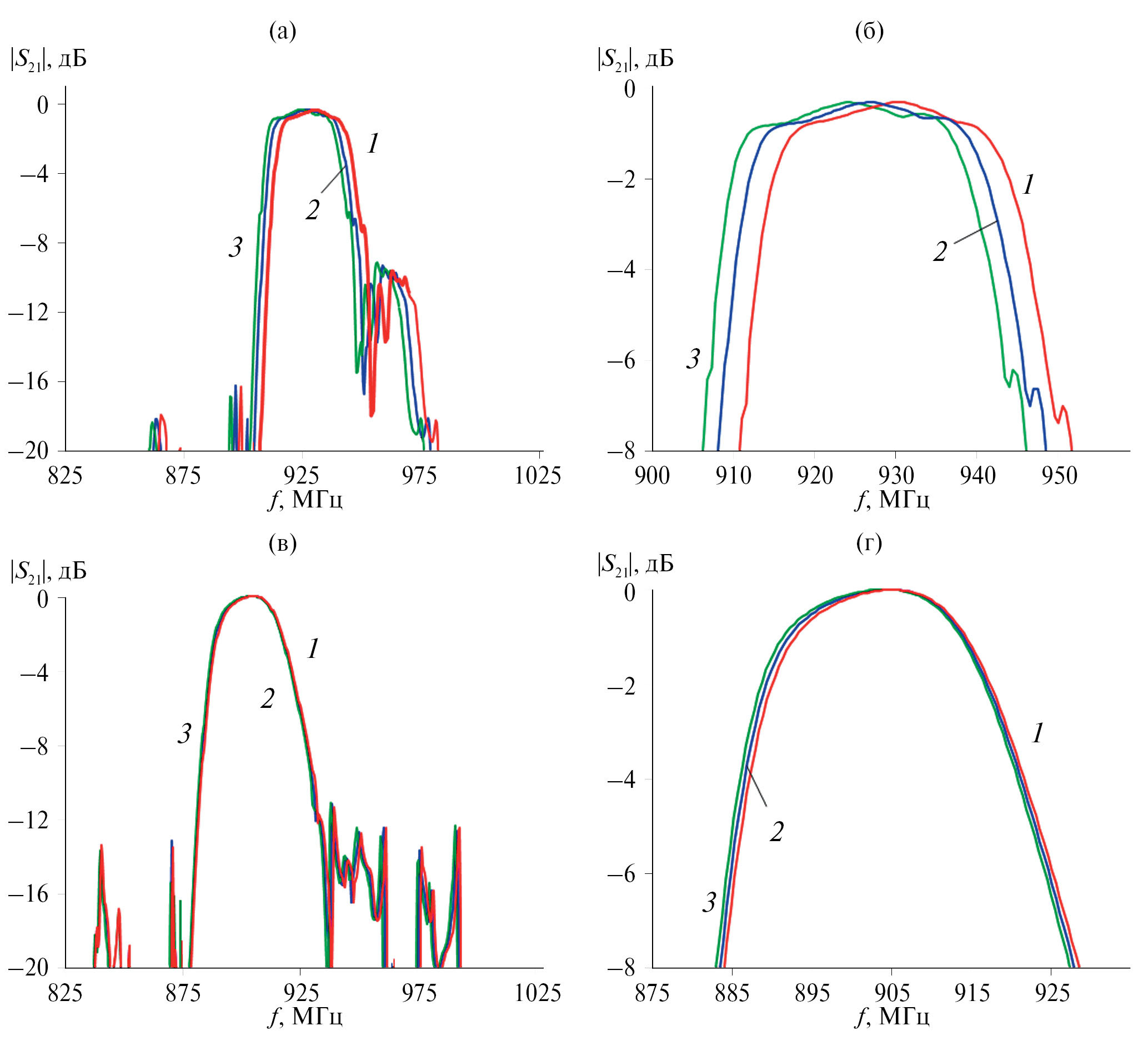 Рис. 6. Амплитудно-частотная характеристика фильтра на ПАВ в зависимости от температуры окружающей среды: а, б – на подложке танталата лития; в, г – для структуры I.H.P.: –60 (1), 25 (2), 85°C (3).