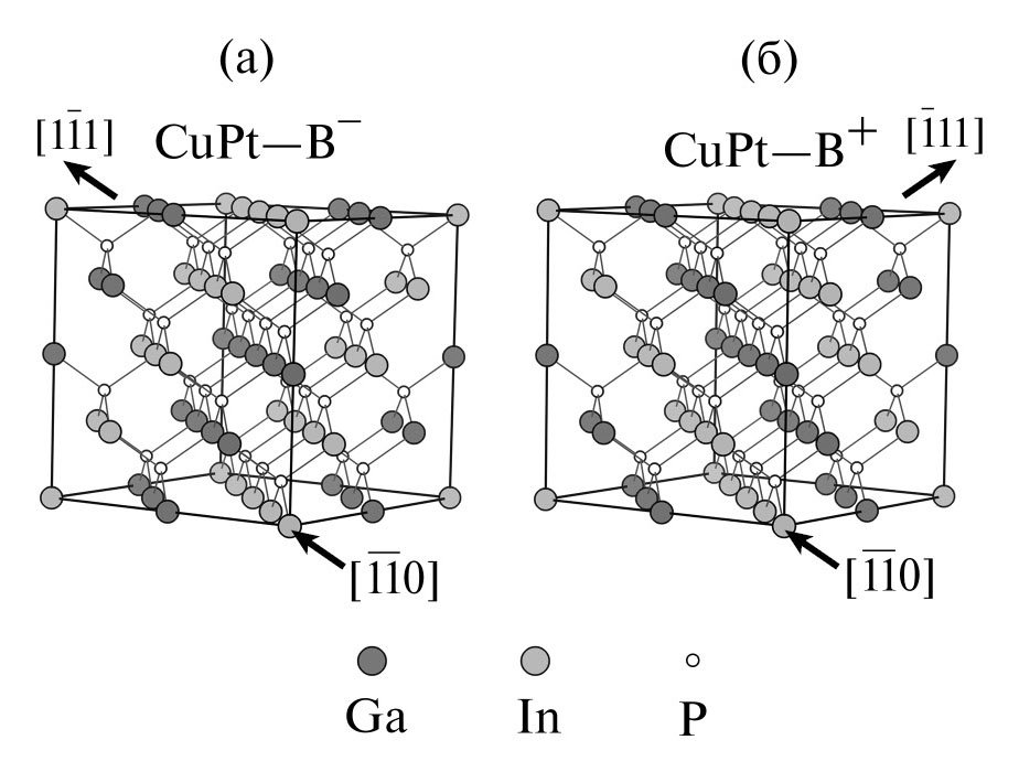Структура атомного упорядочения в GaInP детально изучена и заключается в последовательном чередовании Ga- и In-обогащенных атомных плоскостей {111}B. Такое упорядочение плоскостей (11)B и (11)B принято обозначать как CuPt–B+ и CuPt–B– [6, 16, 17]. Схематические изображения обоих вариантов приведены на рис. 1.