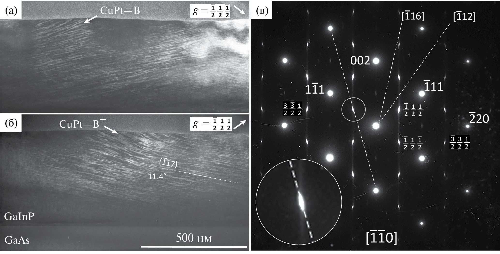На рис. 2a и 2б приведены темнопольные ПЭМ-изображения для двух сверхструктурных отражений пленки Ga0.52In0.48P толщиной ~500 нм. Такие изображения типичны для твердых растворов Ga0.52In0.48P, в которых происходит упорядочение, при наблюдении вблизи оси зоны [0]. На рис. 2в приведена картина дифракции электронов, отвечающая данной области. Здесь отражение соответствует модуляции состава InP–GaP вдоль направления [11], а отражение – вдоль [11]. Из ПЭМ-изображений (рис. 2) видно, что вблизи границы раздела и в объеме пленки упорядоченные домены образуют наклонные узкие полосы. Наклон таких полос относительно плоскости (001) соответствует углу ~11.4°, что близко к положению плоскости (17). При детальном анализе можно заметить, что наклон доменов возникает за счет сдвига плоских упорядоченных участков вправо в варианте CuPt–B– и влево в CuPt–B+ относительно направления роста. Таким образом домены формируют структуру, напоминающую лестницу: где-то с плавным переходом между ступенями, где-то с резким. Пунктирной линией на электронограмме обозначено примерное направление, в котором вытянуты сверхструктурные рефлексы. Оно также характеризует данный наклон.