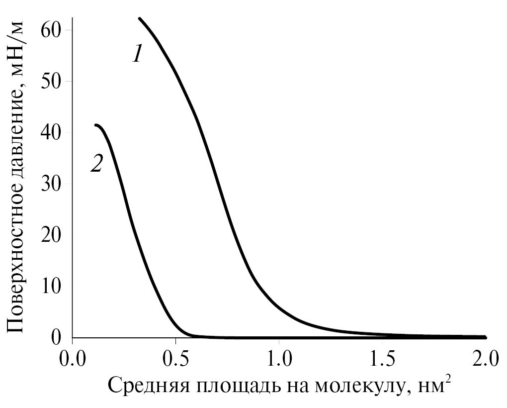 Рис. 1. Изотермы сжатия монослоя симметричных (1) и несимметричных (2) молекул диацетиленовых N-арилкарбаматов на поверхности водной субфазы.