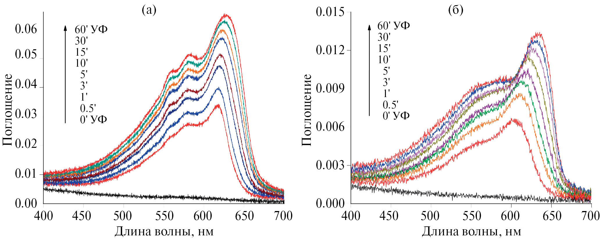 Рис. 2. Изменения спектров оптического поглощения монослойных пленок диинов с изменением времени их облучения УФ-светом: а – симметричного диина, б – несимметричного диина.