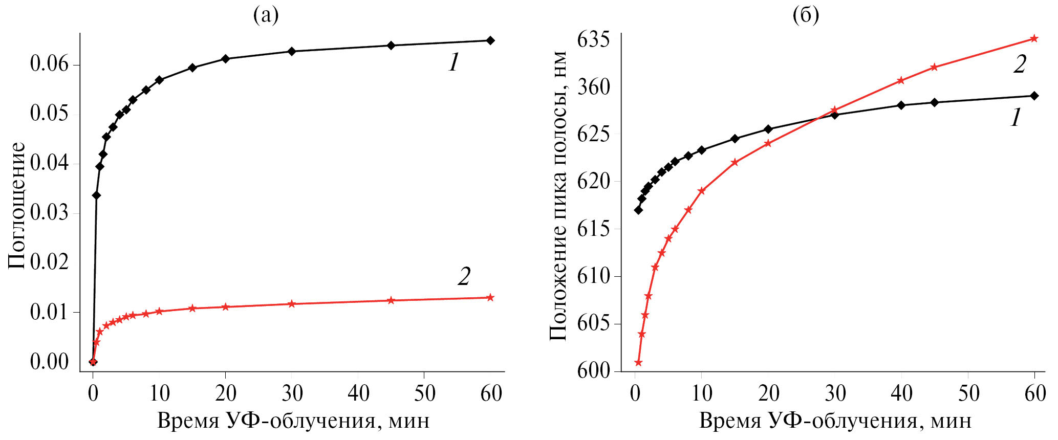 Анализ изменений спектра поглощения образца с монослоем симметричного диина (рис. 2) позволил построить зависимость спектрального положения максимума экситонной полосы голубой фазы ПДА от времени УФ-облучения образца (рис. 3б, кривая 1). На рисунке также показана аналогичная зависимость для монослоя несимметричного диина МеО–3–2. Видно, что характер приведенных зависимостей различен. Через 30 с УФ-облучения пленки, состоящей из молекул симметричного диина, в спектре поглощения образца появилась полоса с максимумом при 617 нм, соответствующая голубой фазе ПДА. В течение первых 20 мин облучения полоса сдвинулась на 8 нм в длинноволновую область спектра. К моменту завершения УФ-облучения (60 мин) зависимость вышла на насыщение (λmax = 629 нм). Таким образом, за время УФ-облучения максимум полосы поглощения сдвинулся на 12 нм, что соответствует увеличению длины сопряжения полимерной цепи в процессе фотополимеризации пленки. В то же время после 30 с УФ-облучения максимум полосы поглощения голубой фазы ПДА для пленки диина МеО–3–2 находился вблизи 601 нм. Такое положение полосы поглощения соответствует минимальной длине сопряжения полимерных цепей для ПДА голубой фазы. При увеличении времени облучения происходил сначала быстрый (до 10 мин облучения), а затем более медленный сдвиг полосы поглощения в длинноволновую область спектра. В результате максимум полосы поглощения после 60 мин облучения находился при 635 нм. Таким образом, с начала фотополимеризации полоса сдвинулась на 34 нм, что указывает на значительное увеличение длины сопряжения полимерных цепей за время облучения. Поскольку после 60 мин облучения кривая зависимости не выходила на насыщение, то процесс вовлечения дополнительных молекул диина МеО–3–2 в реакцию ТТП мог продолжаться и при более длительном облучении образца УФ-светом.