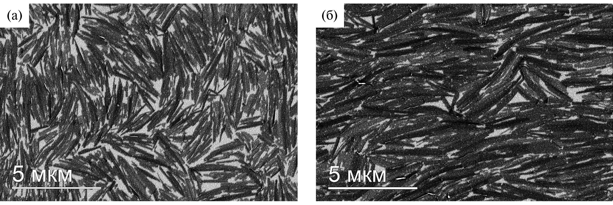 Рис. 4. СЭМ-изображения монослоя молекул несимметричного диина МеО–3–2 на поверхности Si подложек до (а) и после (б) 10 мин УФ-облучения.