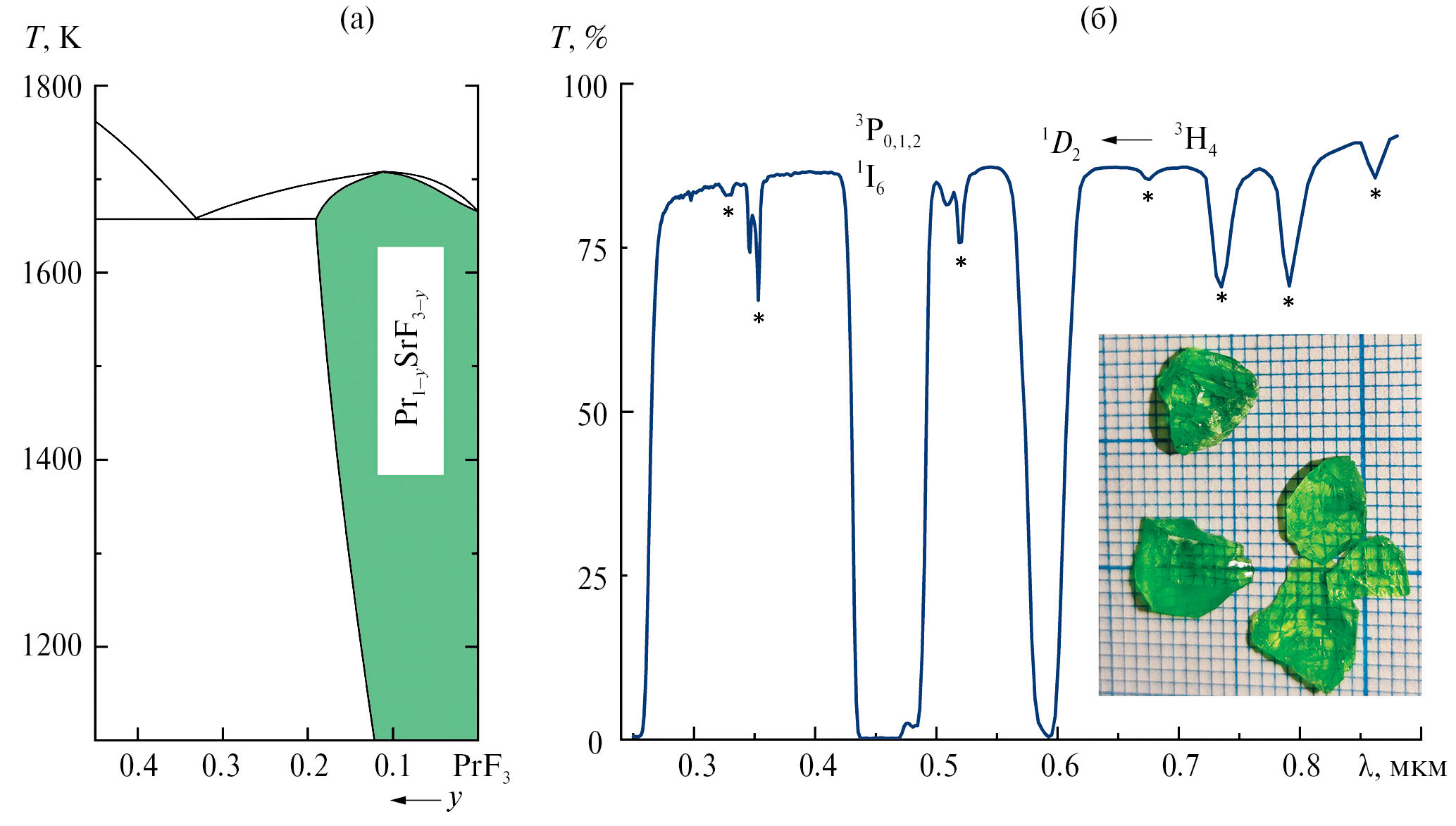 Уточнение состава твердого раствора Pr1–ySryF3–y. Выращенные из расплава кристаллы твердого раствора Pr1–ySryF3–y имеют высокую прозрачность и не содержат рассеивающих включений (рис. 1б). В спектре пропускания кристаллов наблюдаются интенсивные полосы, связанные с электронными переходами с основного 3H4-уровня на расположенные выше уровни 4f-конфигурации иона Pr3+ (рис. 1б). Дополнительно наблюдались слабые полосы, связанные с неконтролируемым содержанием изоморфной примеси ионов Nd3+. Граница пропускания кристаллов Pr1–ySryF3–y расположена при ~0.25 мкм и определяется разрешенными по четности межконфигурационными 4f–5d-переходами.