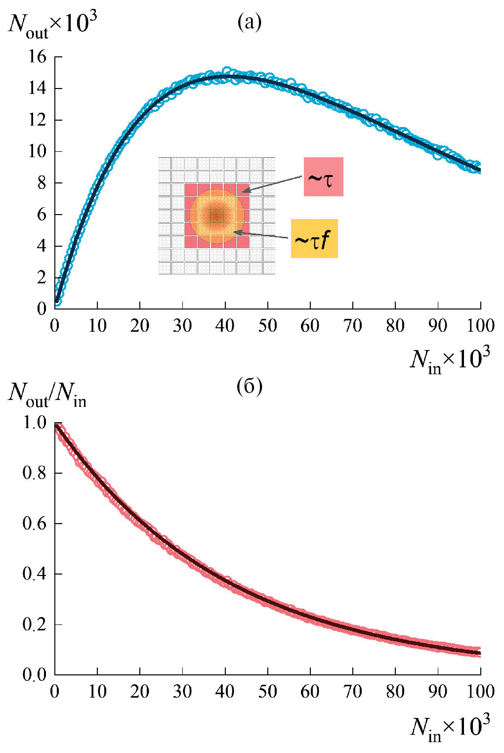 Выбор приемлемой эффективности счета детекторной системы должен базироваться на оценках отношения регистрируемого количества событий к входному потоку. Такие оценки могут быть получены из серии численных экспериментов, заключающихся в генерации сигнала с разной загрузкой и случайным пространственным распределением событий по матрице, его обработке и соотношении получаемой величины регистрируемого потока с величиной входного потока событий. Результаты такого моделирования в диапазоне входных загрузок до 105 фотонов на кадр, а также аппроксимация моделью (1) представлены на рис. 4а.