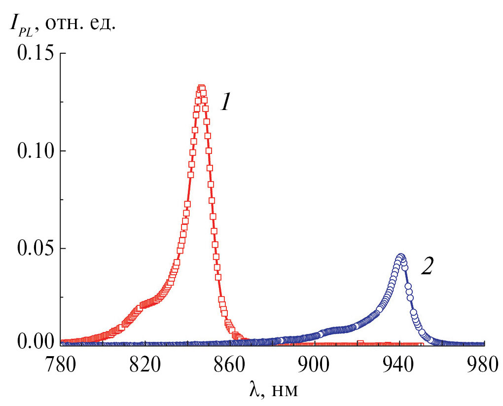 Рис. 3. Спектры ФЛ для гетероструктур 850R (1) и 940R (2) при комнатной температуре.