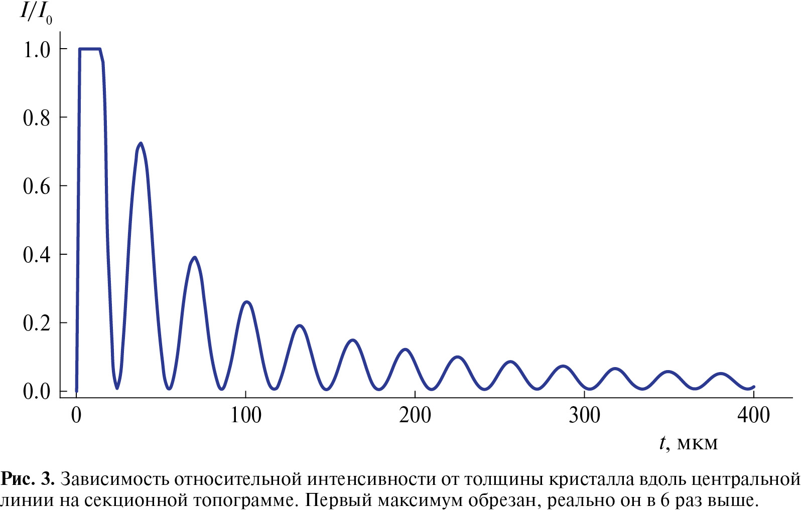 Рис. 3. Зависимость относительной интенсивности от толщины кристалла вдоль центральной линии на секционной топограмме. Первый максимум обрезан, реально он в 6 раз выше.