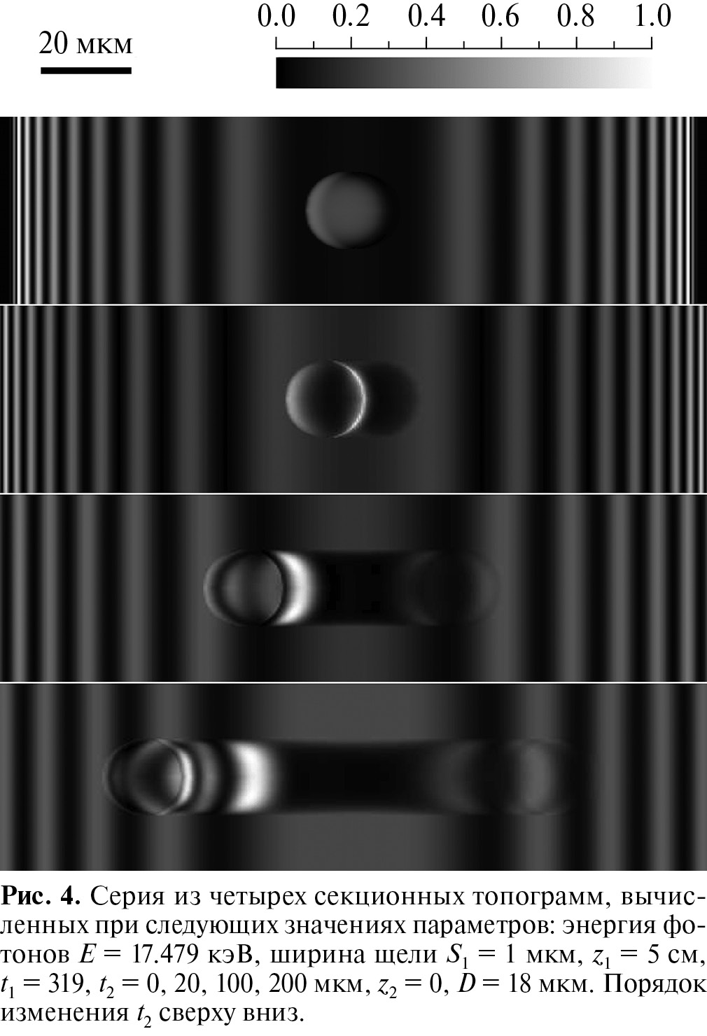 На рис. 4 показаны четыре секционные топограммы, вычисленные по разработанной программе для сферической газовой поры диаметром D = 18 мкм, центр которой находится на линии рис. 3. Параметры расчета (рис. 1) следующие: z1 = 5 см, t1 = 319 мкм, t2 = 0, 20, 100, 200 мкм, z2 = 0. Меняется только толщина второго слоя совершенного кристалла (т.е. после дефекта). Порядок очевиден, т.е. сверху вниз. Как следует из рис. 3, первый слой заканчивается в области максимума осциллирующей интенсивности излучения. Начало второго слоя находится в области минимума. На верхнем фрагменте газовая пора выглядит как светлая на темном фоне. Она просто переносит излучение из верхнего слоя в нижний почти без искажений, хотя небольшие искажения все же присутствуют.