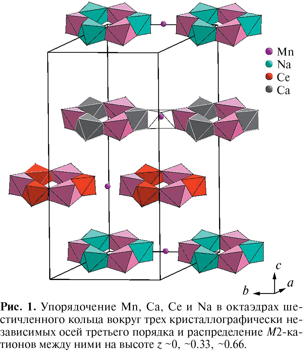 Цирконосиликаты группы эвдиалита [18] характеризуются сложной кристаллической структурой с каркасом состава {Ca6Zr3[Si3O9]2[Si9O27]2}24– из кремнекислородных колец двух типов, объединенных изолированными октаэдрами циркония и уникальными шестичленными кольцами, состоящими из связанных ребрами октаэдров кальция [19–23]. Широкий изоморфизм в позициях каркаса и его полостей – причина чрезвычайного кристаллохимического разнообразия минералов этой группы [24]. Симметрия минералов группы эвдиалита в основном зависит от особенностей химического состава [25], а также от условий их кристаллизации. Эвдиалиты, формирующиеся на ранней стадии кристаллизации при высоких температурах, характеризуются центросимметричной пр. гр. R3m. С понижением температуры в условиях более медленной кристаллизации сложный состав эвдиалитов упорядочивается в рамках ацентричных пр. гр. R3m и R3. Этот переход является следствием скорее кинетических факторов, чем термодинамических (температура, давление), и связан с уменьшением скорости процесса при понижении температуры. Однако химический состав также влияет на симметрию минералов этой группы. Причиной понижения симметрии в них в первую очередь является упорядочение относительно тяжелых элементов гетерополиэдрического каркаса, в то время как вклад в понижение симметрии более легких внекаркасных атомов менее существенен. Установлено [26], что среди минералов с пр. гр. R3 возможно упорядочение с дальнейшим понижением симметрии и переходом в пр. гр. Р3 в семействе низкокальциевых представителей, в которых отсутствие плоскости симметрии обусловлено упорядочением состава в уникальных шестичленных кольцах, образованных связанными по ребрам октаэдрами, при замещении кальция марганцем, железом, редкоземельными элементами и рядом других элементов.