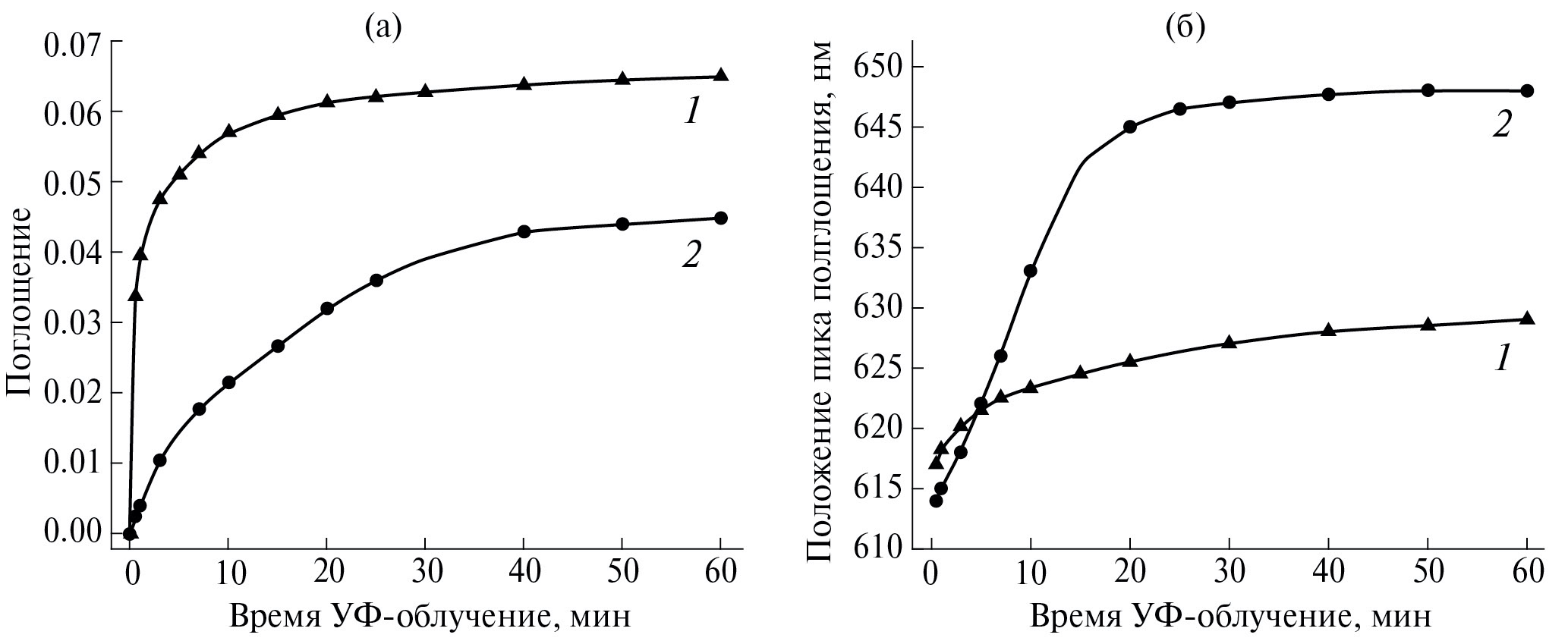 Рис. 3. Изменения интенсивности экситонной полосы поглощения ПДА (а) и ее смещения в длинноволновую область спектра (б) с увеличением времени воздействия УФ-излучения на пленки диинов n3-3 (1) и n6-6 (2).