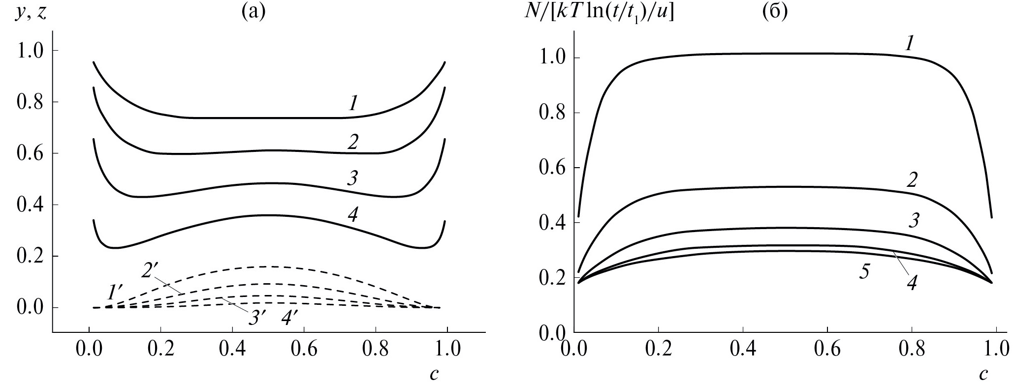Рис. 3. Параметры оптимальной флуктуации, характеризующие числа конфигураций атомов сортов AB y = n1/N (сплошные кривые) и BA z = n2/N (штриховые кривые) (а), для значений движущей силы Fa/u: 0.1 (1, 1′), 0.2 (2, 2′), 0.3 (3, 3′), 0.4 (4, 4′). Полное число конфигураций в барьере N в зависимости от средней концентрации раствора при различных значениях безразмерной движущей силы Fa/u: 0.1 (1), 0.2 (2), 0.3 (3), 0.4 (4), 0.5 (5).