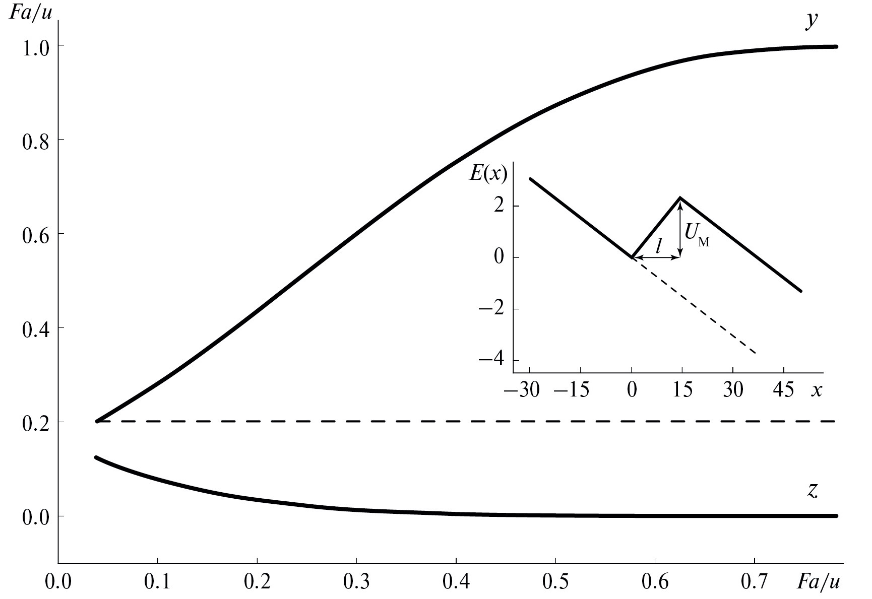 Рис. 4. Зависимость от движущей силы Fa/u параметров оптимальной флуктуации – концентраций y атомов сорта A и z атомов сорта B внутри флуктуации – при средней концентрации атомов раствора A в объеме материала (штриховая линия) с = 0.2. На вставке – форма барьера, создаваемого оптимальной флуктуацией, при с = 0.3, Fa/u = 0.1.