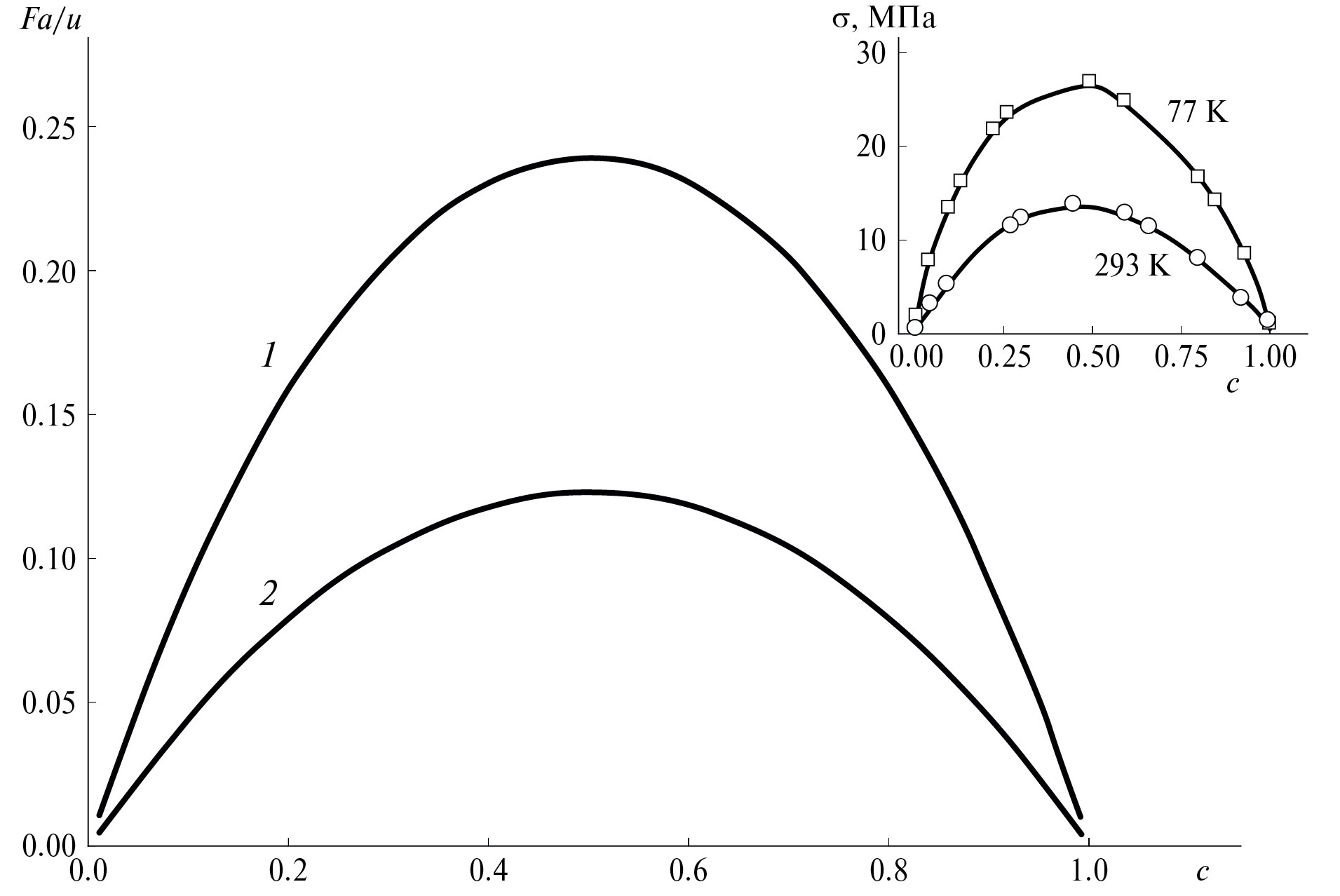 Рис. 5. Зависимость пороговой движущей силы от средней концентрации атомов раствора при 77 (1) и 293 К (2) (в безразмерных единицах Fa/u и kT/u соответственно). На вставке для качественного сравнения показано деформирующее напряжение твердого раствора KCl–KBr при тех же температурах по данным [4].