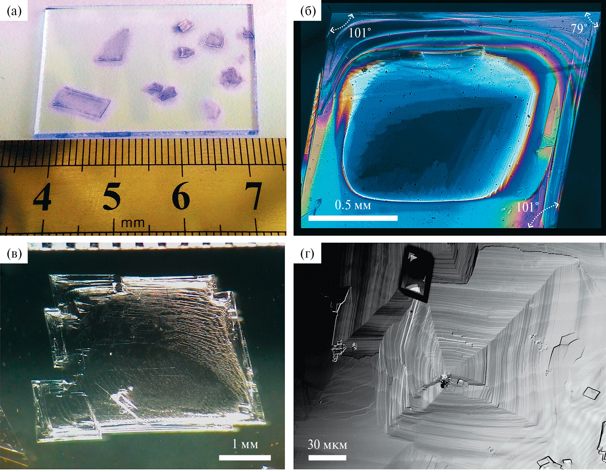 Рис. 2. Кристаллы TMS-4P-TMS: а – на предметном стекле при УФ-подсветке; б – изображение монокристалла в скрещенных поляризаторах; в – изображение крупного монокристалла, сформированного на границе раздела раствор–воздух; г – дислокационная пирамида роста на поверхности кристалла.