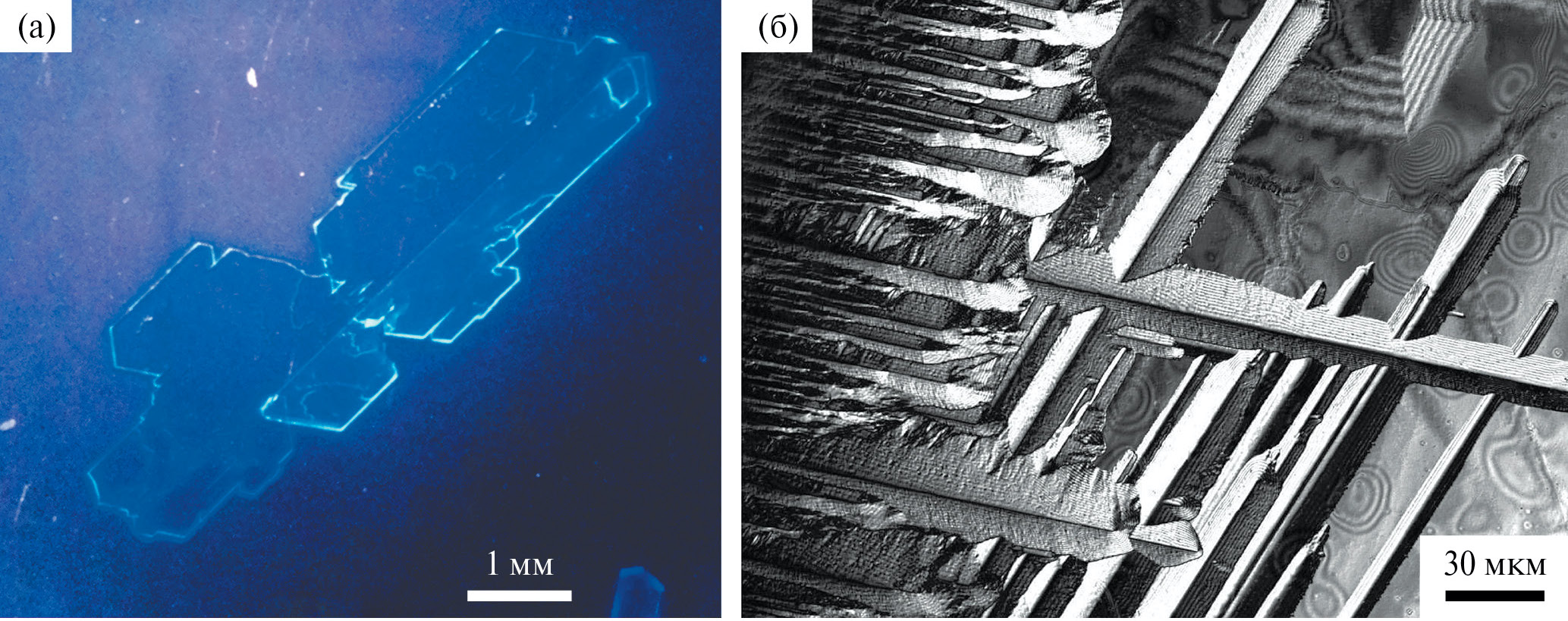 Распространенной формой среди кристаллов 4Р также является ограниченный боковыми гранями [110], [110], [1 1 0] и [110] плоский параллелограмм с внутренними углами ~70° и ~110° [34]. В аналогичных условиях скорость продольного и поперечного роста кристаллов 4P заметно ниже, чем у TMS-4P-TMS. Информация о росте кристаллов 4P на границе раздела жидкость–воздух в табл. 2 дополнена новыми сведениями по росту в объеме раствора. В данных условиях кристаллы 4P формируются крупнее и утолщеннее, но с более развитой поверхностной микроморфологией. В качестве примера на рис. 4а представлен кристалл 4P со сростком вдоль длинной оси кристалла. Основной кристалл и сросток имеют плоскую форму. На поверхности развитой грани наблюдается множество линейно протяженных холмиков роста высотой до 2 мкм, которые в ряде областей формируют дендритные структуры с крестообразными пересечениями под углом ~70°. Подобные особенности поверхностной микроморфологии были зафиксированы ранее при исследовании роста из растворов кристаллов пара-терфенила [15] и пара-квинкифенила [6].