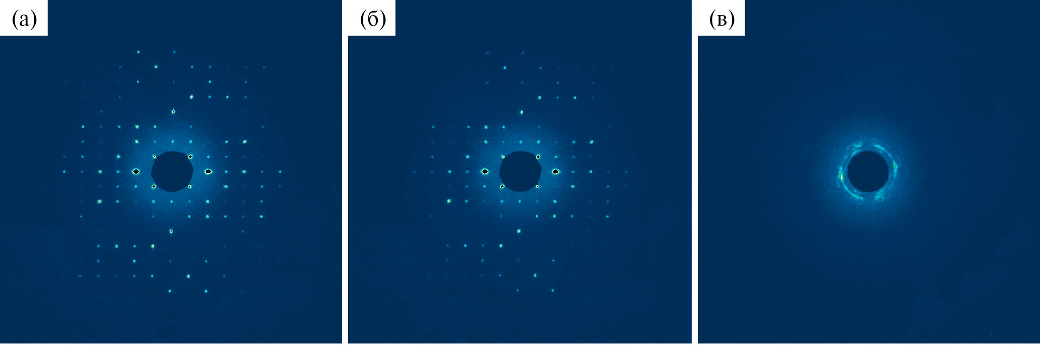 Рис. 5. Дифрактограммы монокристаллаTMS-4P-TMS при температурах 20 (а), 127 (б) и 152°С (в).