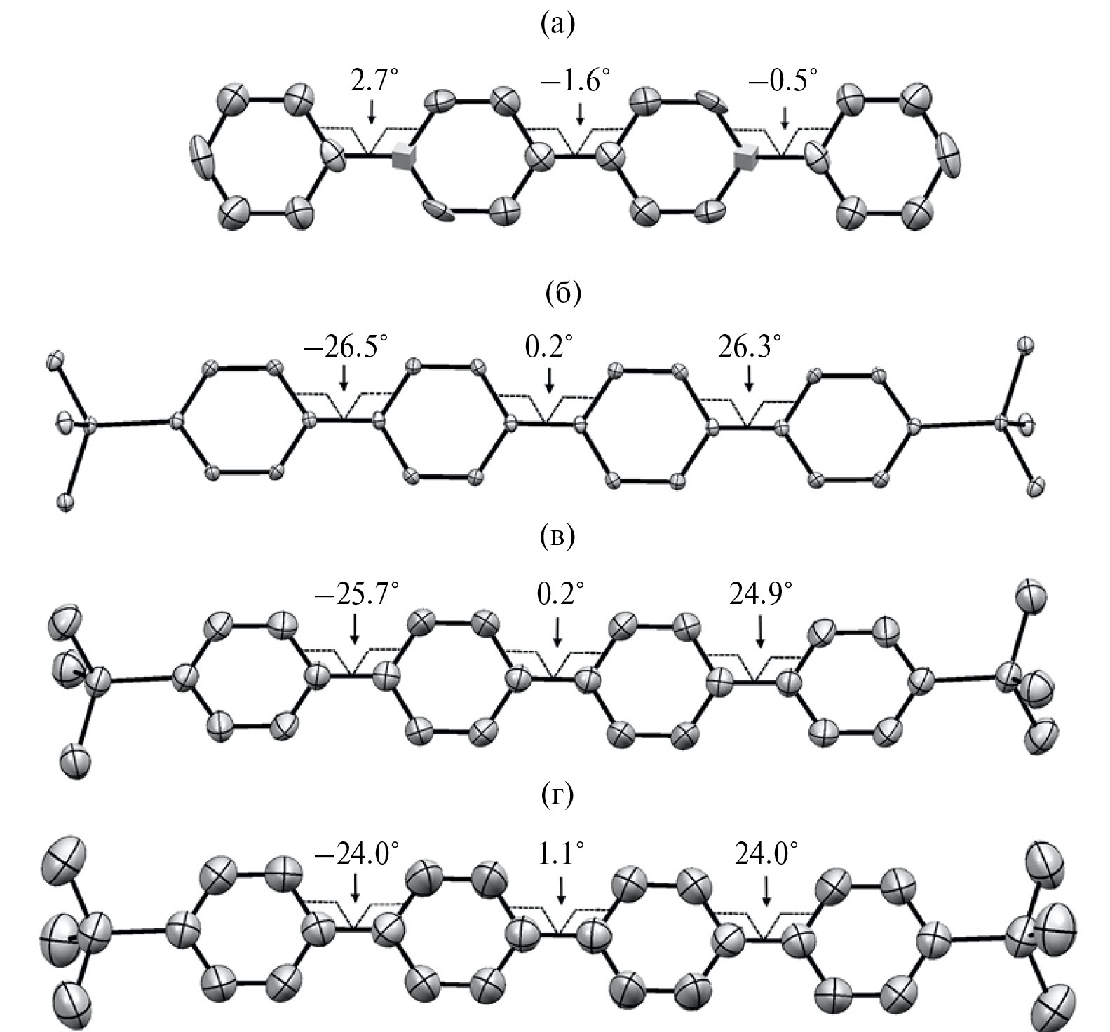 Структура молекул в кристаллах при различных температурах представлена на рис. 6. При комнатной температуре конформация молекулы 4P почти плоская, с торсионными углами между фенильными группами не выше 3°, при этом тепловые эллипсоиды атомов углерода уширены (рис. 6а). В низкотемпературной триклинной фазе конформация молекулы 4P не плоская, со значительным разупорядочением фенильных групп. Сопряженное ядро молекул TMS-4P-TMS также имеет неплоскую структуру, незначительно изменяющуюся в диапазоне от –188 до 127°С. Внутренние фенильные кольца практически компланарны, а внешние – развернуты относительно внутренних в одну сторону с торсионными углами ~25° (рис. 6б–6г). С ростом температуры наблюдаются незначительное увеличение торсионного угла между внутренними фенилами и в равной степени уменьшение торсионных углов между внешними фенильными группами с 26° до 24°. Тепловые эллипсоиды атомов углерода и кремния молекул TMS-4P-TMS при –188°С небольшие, но по мере увеличения температуры отмечается их заметное уширение.