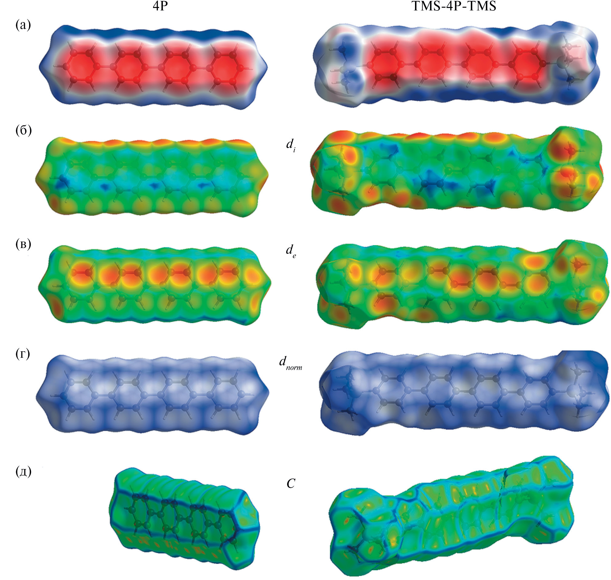 На рис. 9 представлены поверхности Хиршфельда молекул 4P и TMS-4P-TMS с нанесенными на них значениями: электростатического потенциала (а), кратчайших расстояний di (б) и de (в) от точки поверхности до ближайших внутренних и внешних атомных ядер соответственно, нормализованного контактного расстояния dnorm (г) и величины изогнутости поверхности C (д).
