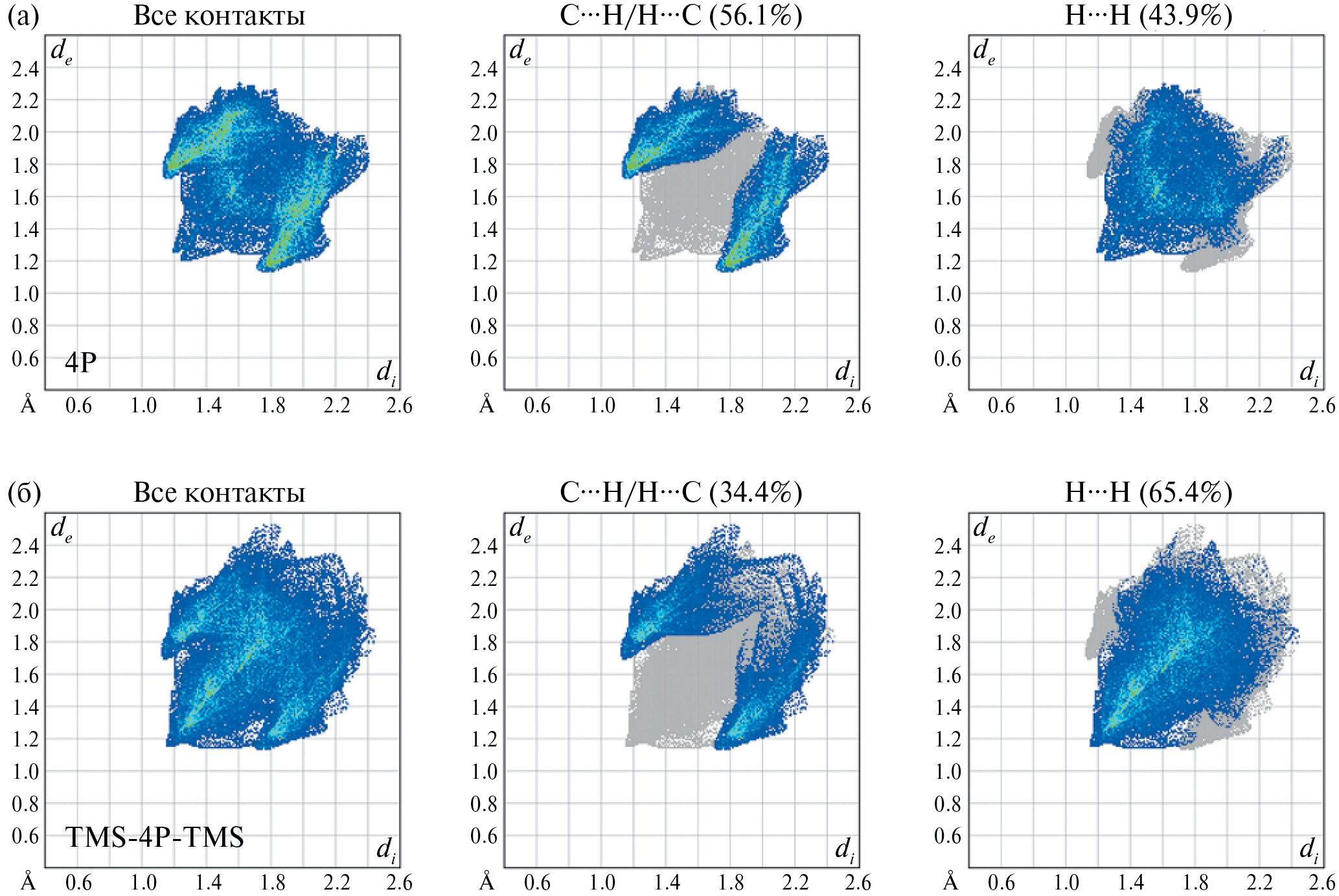 На рис. 10 представлены 2D-графики “отпечатков пальцев” межмолекулярных взаимодействий в кристаллах 4P и TMS-4P-TMS. Данные двумерные графики представляют визуальную сводку частоты каждой комбинации di и de на поверхности Хиршфельда молекулы. Цветом на графике “отпечатков пальцев” обозначены интенсивности контактов: наиболее слабые – синим и далее по спектру по мере увеличения интенсивности взаимодействия вплоть до красного цвета. Таким образом, графики “отпечатков пальца” как функция интенсивности взаимодействия в координатах (di, de) характеризуют все межмолекулярные контакты одновременно и дают количественное представление о природе и типе связей между молекулами в кристалле. На рис. 10 также показаны разложения графиков “отпечатков пальцев” для основных двух типов контактов, имеющих место в кристаллах 4P и TMS-4P-TMS: C···H и H···H. Относительно диагонали de = di образ двумерного “отпечатка пальца” имеет псевдозеркальную симметрию.