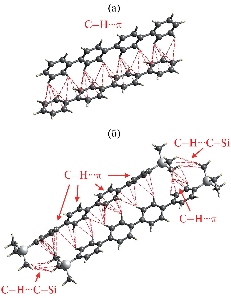 Рис. 11. Кратчайшие контакты C–H∙∙∙C между молекулами 4P (а) и TMS-4P-TMS (б) в кристаллах, длина которых не выше 3.5 Å.