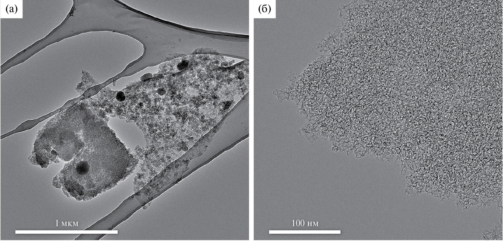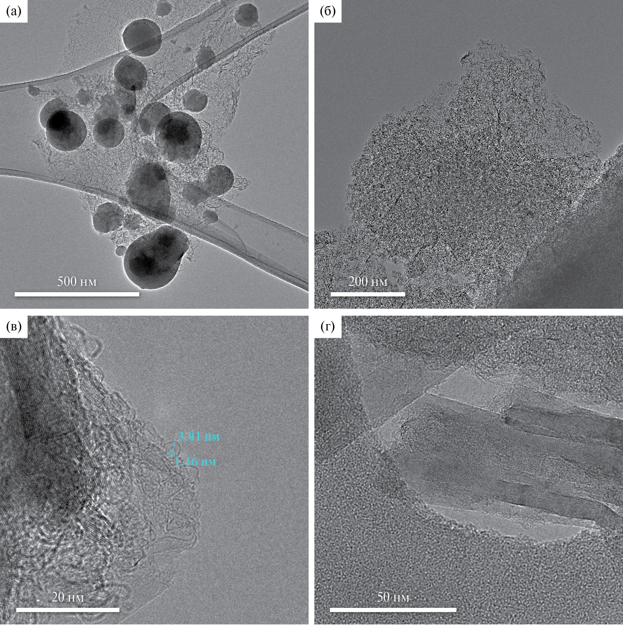 По данным метода ПЭМ образец, прошедший СВЧ-карбонизацию в среде СО2, представляет собой аморфные частицы с включениями размером от 50 до 250 нм (рис. 1а, 1б). Обнаружены зарождающиеся луковичные или фуллереноподобные частицы (рис. 1в) [13, 14] и многостенные углеродные нанотрубки (рис. 1г) [6].