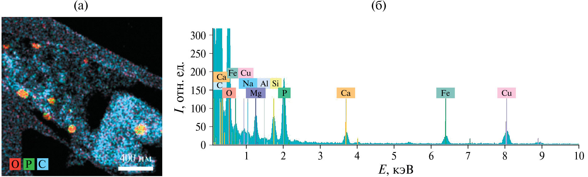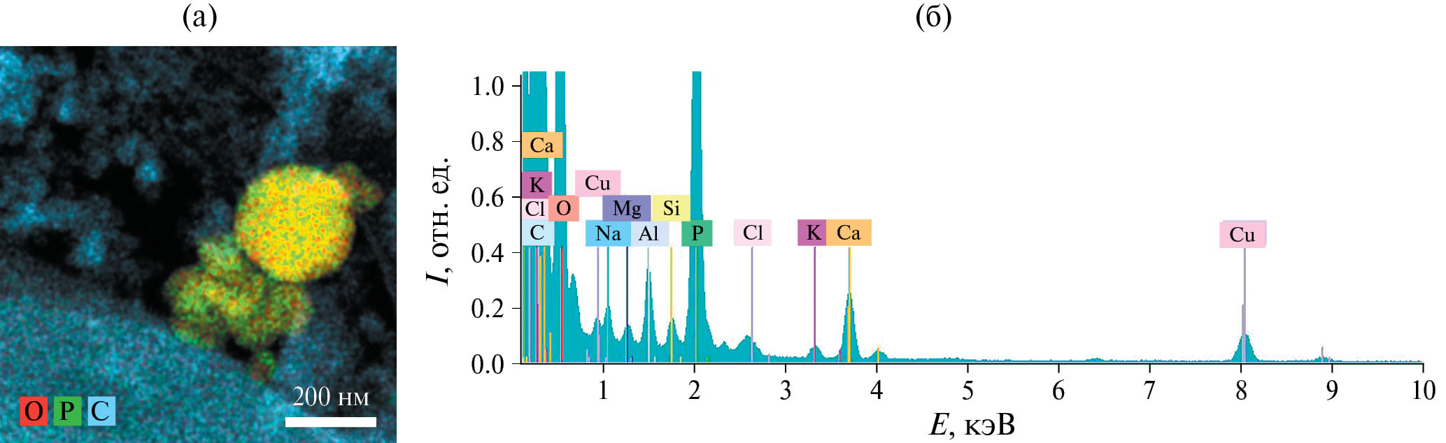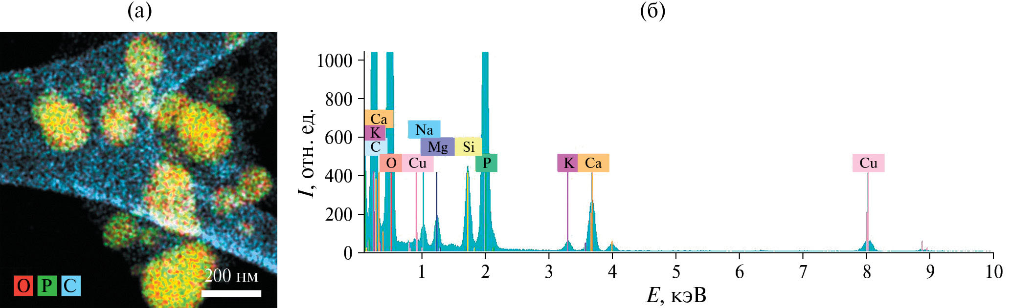 Частицы состоят из углерода, включения – из фосфора, кислорода, калия, кальция, кремния, натрия, магния, что подтверждается картами распределения элементов (рис. 2а) и ЭДР-спектром (рис. 2б). Присутствие пиков меди в спектре связано с использованием медной сетки для электронно-микроскопических исследований.