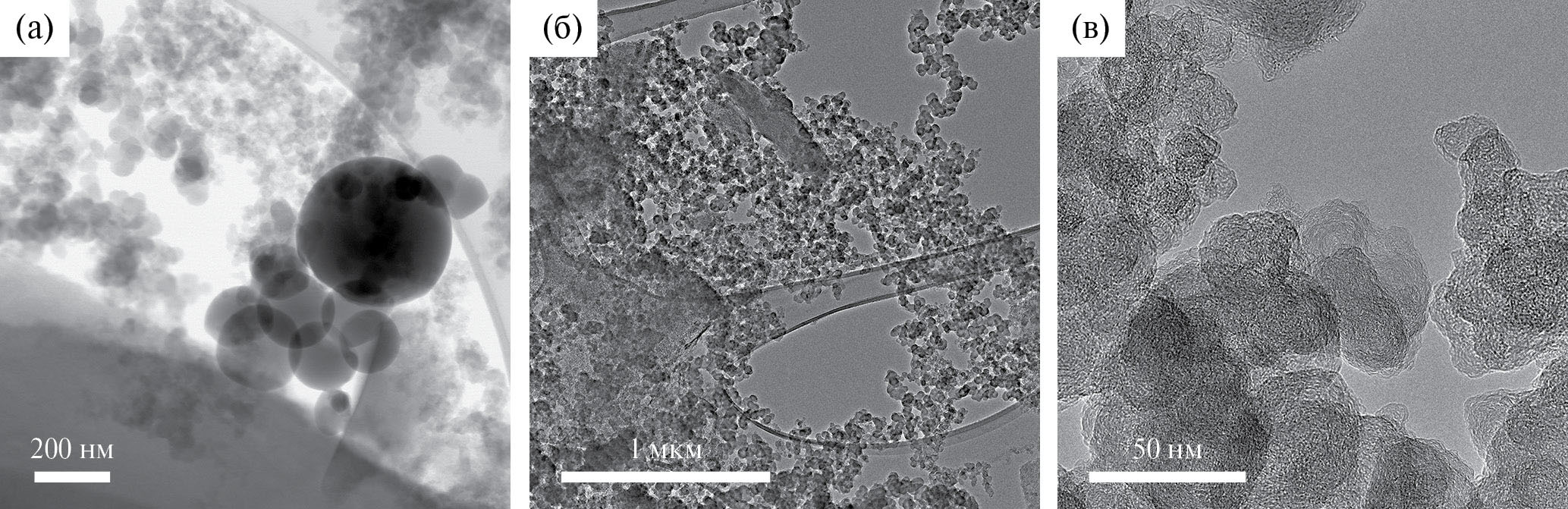 Образец, карбонизированный в нейтральной среде N2, представляет собой аморфные частицы с включениями размером от 50 до 400 нм (рис. 3а). Также в поле зрения попало большое количество нанолуковиц – луковичная форма углерода (рис. 3б, 3в).