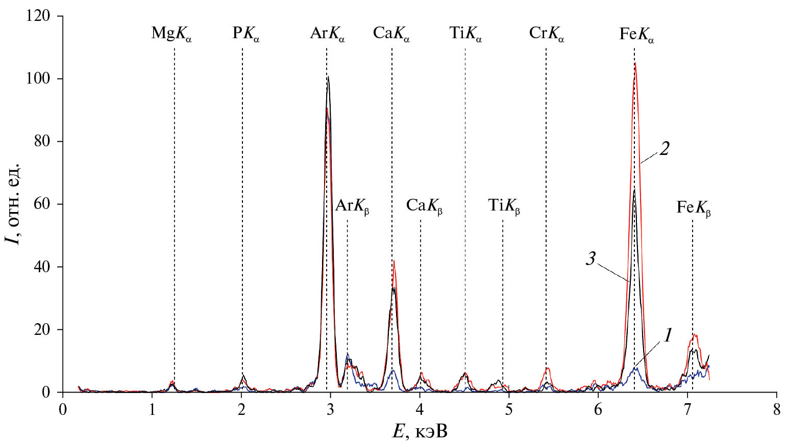 Рис. 7. Рентгенофлуоресцентные спектры исследуемых образцов в газовых средах: 1 – СО2, 2 – N2, 3 – Ar. Пики Ar (воздух) и Fe (коллиматор) – аппаратные.
