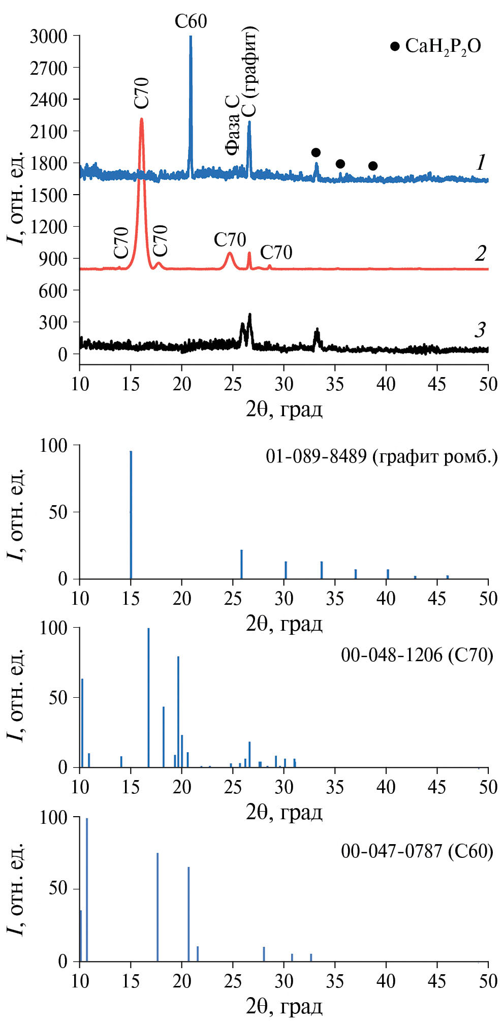 Образец, карбонизированный в газовой среде СО2 (рис. 8, кривая 2), отвечает гексагональной фазе графита (PDF 03-065-6212) [16]. Пики этой фазы графита наблюдаются у всех образцов. Образец, карбонизированный в газовой среде N2 (рис. 8, кривая 1), характеризуется большей степенью кристалличности. Однако присутствует крайне интенсивный пик, относящийся к фуллерену С60 (PDF 00-047-0787) [17], что согласуется с электронно-микроскопическими исследованиями (рис. 3б, 3в). При этом наиболее интенсивный пик 002 (2θ = 10.8°) отсутствует ввиду значительной величины аморфной компоненты на начальных углах съемки, удаленной на представленной рентгенограмме. В двух других образцах эта фаза не обнаружена. Для образца, карбонизированного в среде СО2 (рис. 8, кривая 2), установлено образование фуллерена С70 (PDF 00-048-1206) [18] в подтверждение обнаруженных методом ПЭМ фуллереноподобных частиц (рис. 1в, 1г). Отметим, что фуллерены обладают высокой адсорбционной способностью, как самостоятельный адсорбент они значительно эффективнее активированного угля [19, 20].