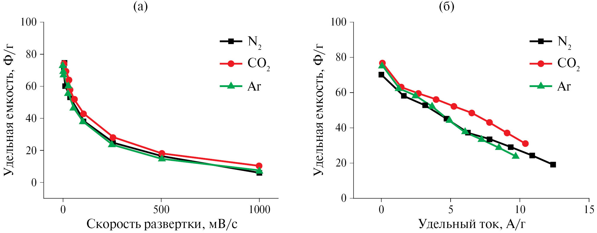 На рис. 9а приведены зависимости удельной емкости от скорости развертки потенциала, полученные методом ЦВА, для электродов, изготовленных в различных средах. Видно, что по мере увеличения скорости развертки емкость всех материалов падает. Наибольшей емкостью во всем исследуемом диапазоне скоростей разверток характеризуются электроды, полученные с использованием среды CO2. На рис. 9б представлены полученные методом ГЗР зависимости от удельного тока удельной емкости электродов, изготовленных в различных средах. Они аналогичны зависимостям удельной емкости от скорости развертки. Наибольшую емкость демонстрируют электродные материалы из угля, полученного с использованием CO2, однако с увеличением удельного тока от 0.04 до 2 А/г его удельная емкость резко падает, при дальнейшем увеличении тока она достаточно равномерно снижается.