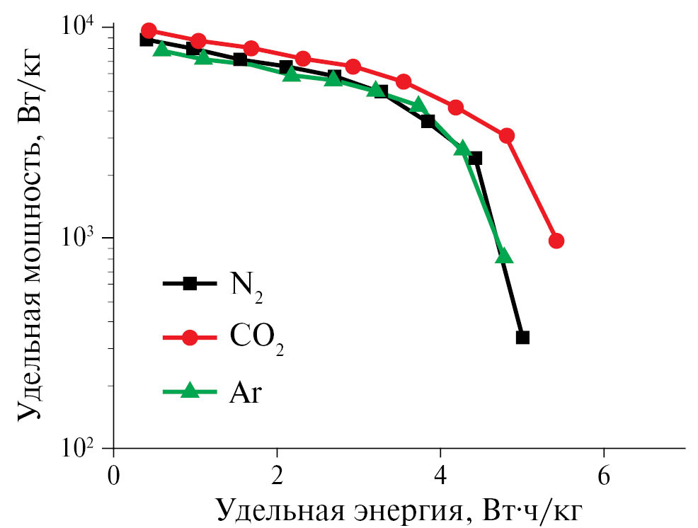 Для сравнения эксплуатационных характеристик (удельной мощности и удельной запасаемой энергии) различных источников тока на рис. 11 приведена диаграмма Рейгона. Характеристики всех полученных электродов лежат в типичных диапазонах для суперконденсаторов с двойным электрическим слоем: удельная мощность – от 1000 до 10000 Вт/кг, удельная энергия – от 1 до 10 Вт∙ч/кг. Лучшим сочетанием этих характеристик обладает материал, полученный с использованием CO2.