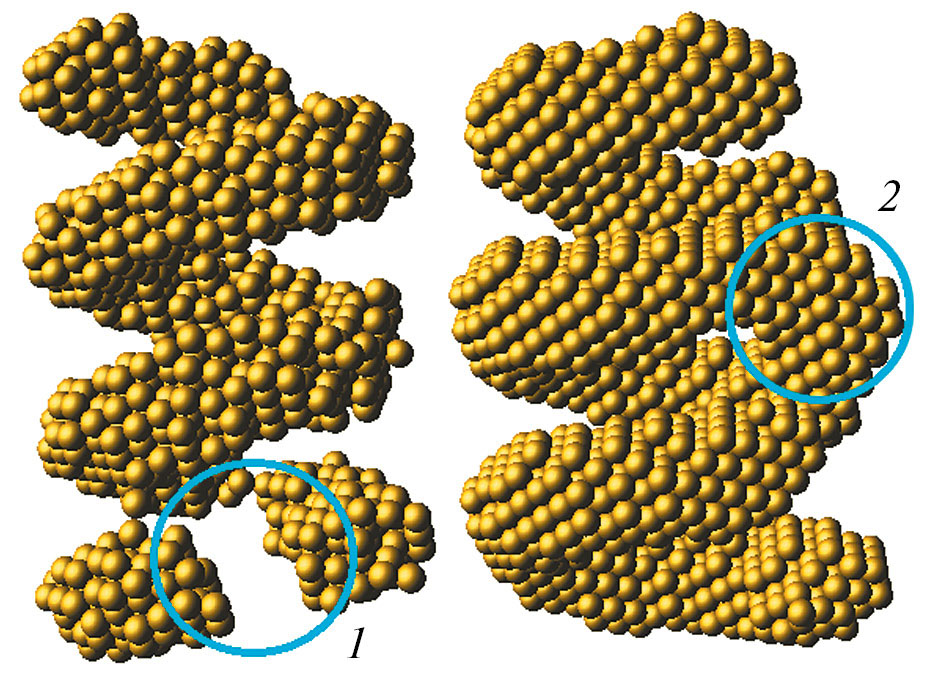 Частичное или полное отсутствие оптимального диапазона весов для структуры I свидетельствует о нестабильности структуры, которая, вероятно, связана с близостью длин отрезков, соединяющих различные структурные части спирали. Поскольку веса варьировались в диапазоне, гораздо большем, чем обычно используется на практике, вероятно, оптимальный диапазон весов может быть найден при других значениях n и Nsh, не использованных в настоящей работе, либо при использовании иных подходов. Другой причиной разброса решений при восстановлении формы спирали может являться излишняя плотность расположения шариков. Для структуры I кратчайшее расстояние между витками равно 15 Å, что приблизительно равно двум–трем шарикам при радиусе шариков 3.5 Å. В таких условиях минимизация рыхлости вряд ли сможет способствовать реконструкции спирали. Причина в том, что поверхностные атомы, имея небольшое число контактов, вносят вклад в оценку рыхлости и поэтому наиболее выгодной с точки зрения штрафа за рыхлость может являться структура со слипшимися витками, которая имеет меньшую удельную площадь поверхности. Кроме того, слипание витков наиболее выгодно с точки зрения штрафа за разрывность частицы. В случае истинности данной причины необходимо уменьшение радиуса шариков до минимально возможного, при котором структурный фактор их упаковки еще не влияет на форму кривой рассеяния.