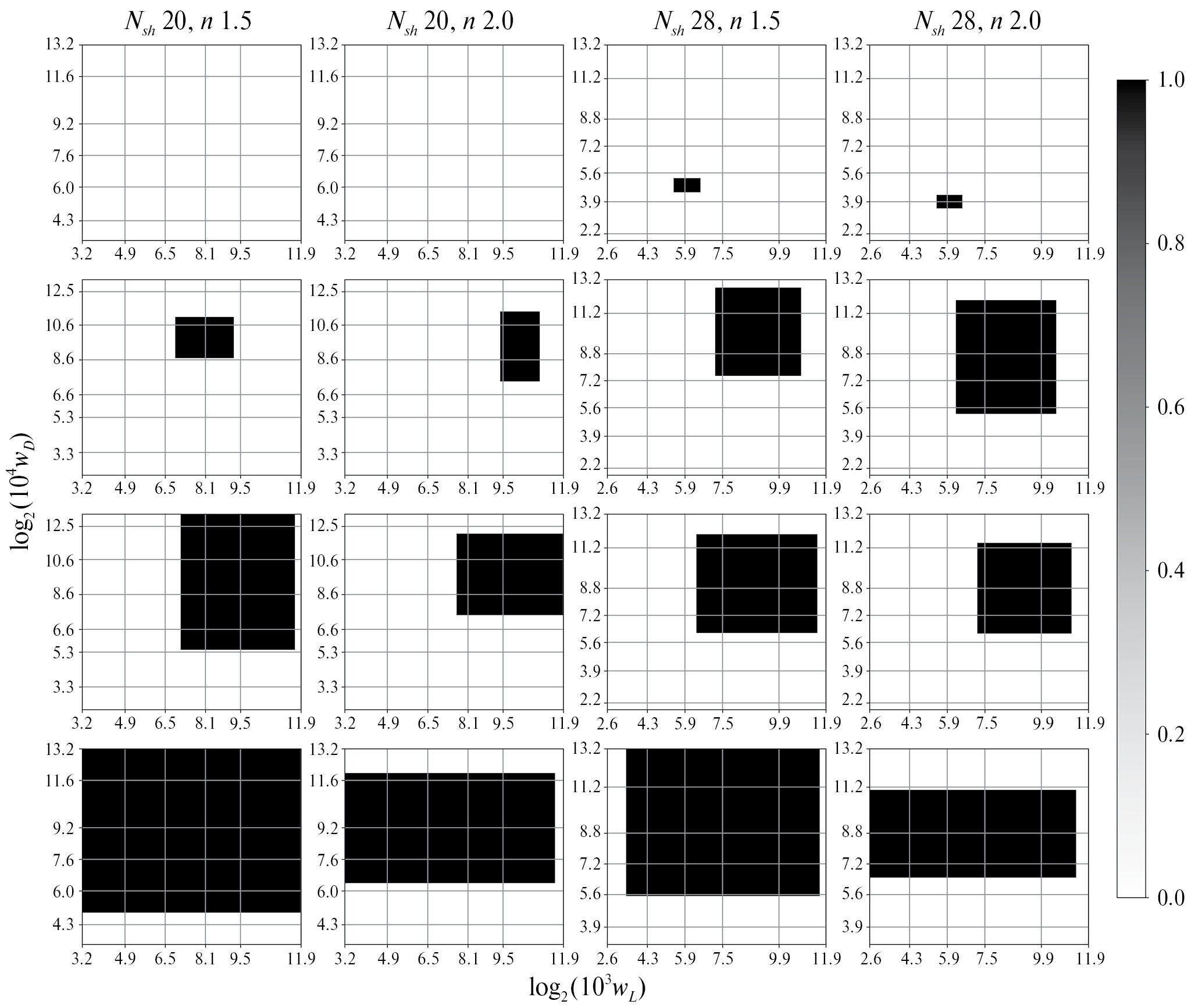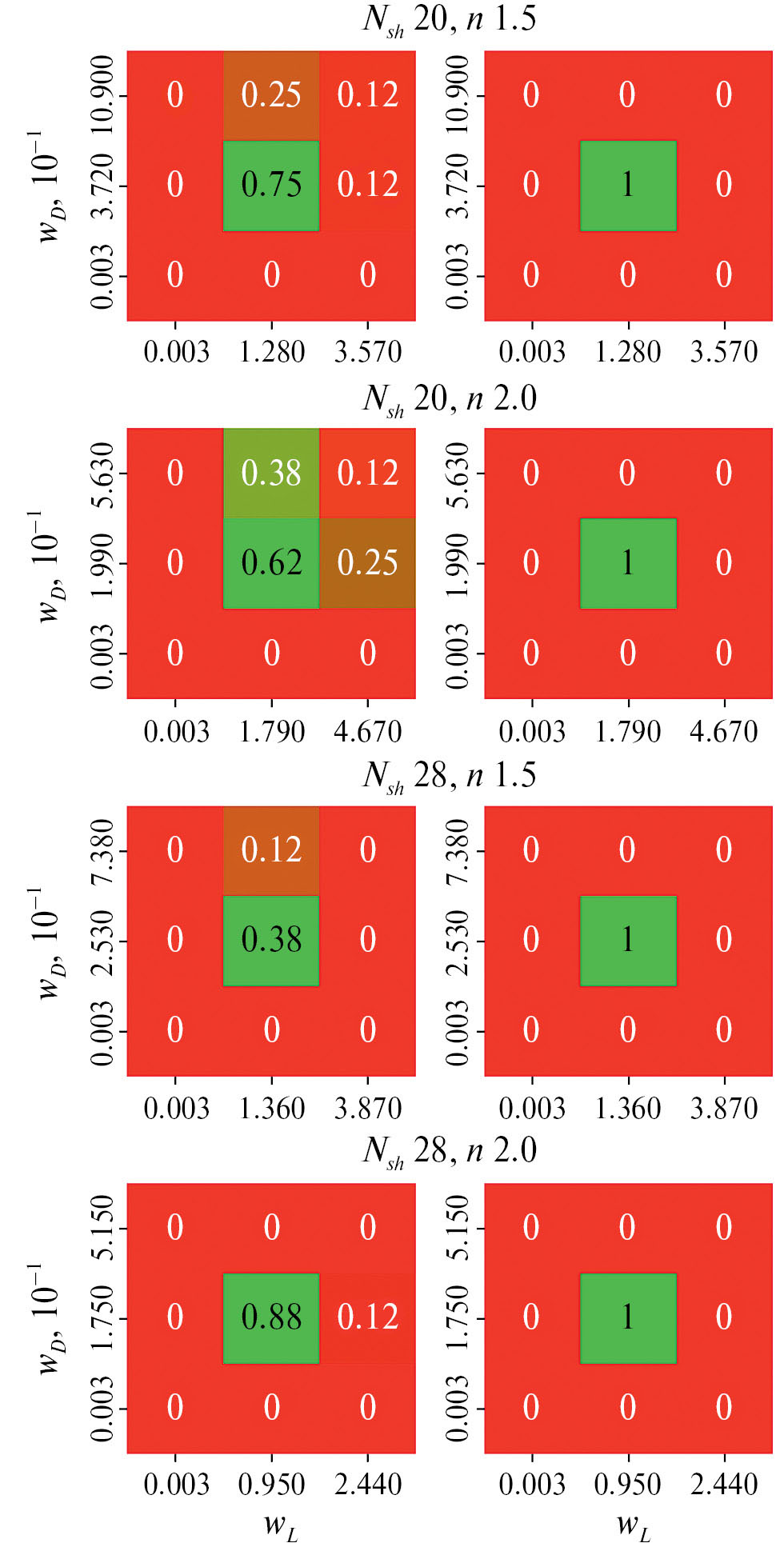 Из рис. 5 видно, что чем меньше шаг спирали, тем меньше области положительных расчетов (черный цвет). Для структуры I при Nsh = 20 отсутствуют положительные расчеты в рамках принятой обработки расчетов. Для этой же структуры при Nsh = 28 есть несколько обособленных областей положительных расчетов, которые, однако, могут являться результатом случайных выбросов в работе алгоритма.