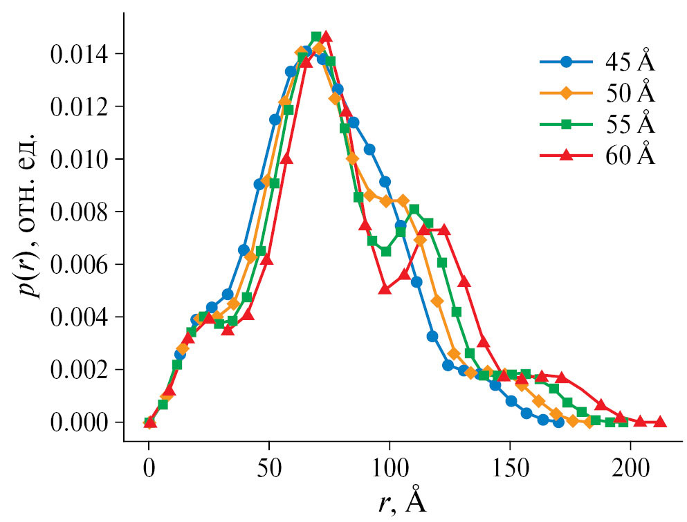 Одним из незаменимых методов для получения информации о строении наночастиц (НЧ), размеры которых составляют от 10 до 5000 Å, является малоугловое рентгеновское рассеяние (МУРР) [1]. Этот неразрушающий метод позволяет получить такую информацию о НЧ, как форма, масса, радиус инерции, объем и максимальный размер. Расчет большинства характеристик НЧ доведен до автоматизма, однако до сих пор представляет интерес поиск трехмерной формы НЧ монодисперсной системы. Существует несколько способов представления трехмерной формы. Так, в [2, 3] использовали разложение плотности частицы на сферические гармоники с последующим поиском коэффициентов разложения с помощью численных методов. В [4] использовали метод машинного обучения для построения модели по данным МУРР. В большинстве методов поиска трехмерной формы используют шариковую модель НЧ, в которой структура представлена в виде набора однородных шариков, находящихся в узлах гексагональной решетки. Эти методы реализованы в наиболее популярных программах DAMMIN [5] и DAMMIF [6]. Основное различие программ в том, что в первой шариковая модель ограничена заданной областью, обычно сферой с диаметром, равным максимальному размеру частицы, а во второй – область поиска не ограничена.