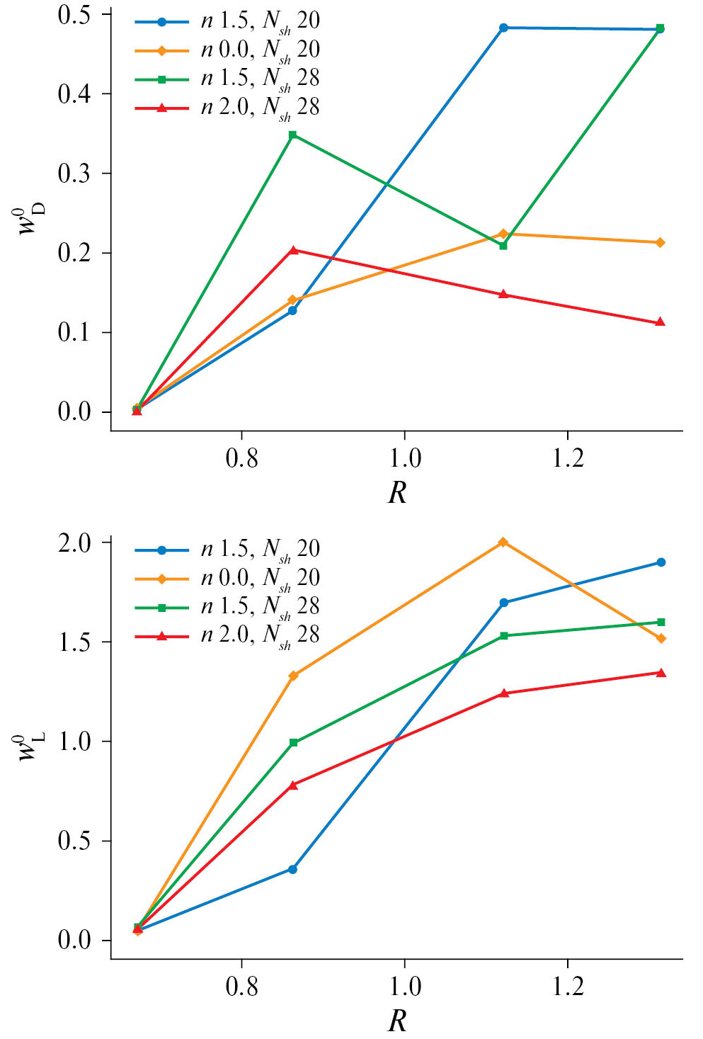 Рис. 8. Оптимальные значения весов штрафов за рыхлость (wL) и разрывность (wD) частицы в зависимости от разрешения пиков R на кривой p(r) для различных пар значений степени весовой функции (3) n и числа шенноновских каналов Nsh.