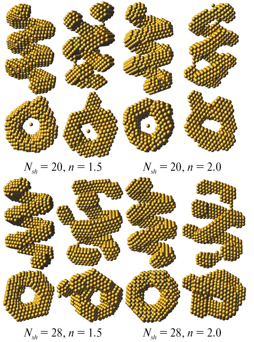 Хотя приведенные выше рассуждения характерны для спиралей, подобные рассуждения можно провести для любых частиц, обладающих следующим свойством: отрезки одной и той же длины, концы которых принадлежат объему частицы, лежат как внутри частицы, так и могут пересекать пустое пространство. В случае со спиралями это отрезки, лежащие внутри одного витка, и отрезки, соединяющие соседние витки. В зависимости от величины весов штрафных членов в (1) в формируемой структуре частицы может преобладать количество тех или иных отрезков. Другим необходимым условием является наличие двух и более пиков на кривой p(r), указывающих на преобладание двух и более средних длин отрезков.