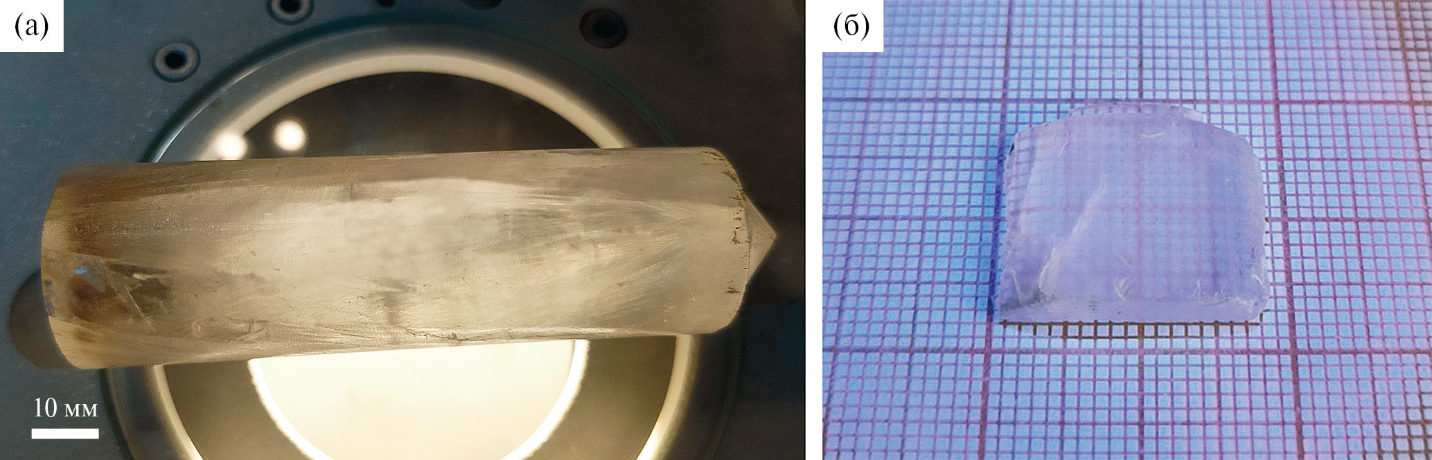 Рост кристаллов. На рис. 1а представлен выращенный из расплава монокристалл 3P. Для исследования спектрально-люминесцентных и сцинтилляционных свойств из полученного кристалла был изготовлен элемент размером 15 × 18 × 3 мм (рис. 1б).