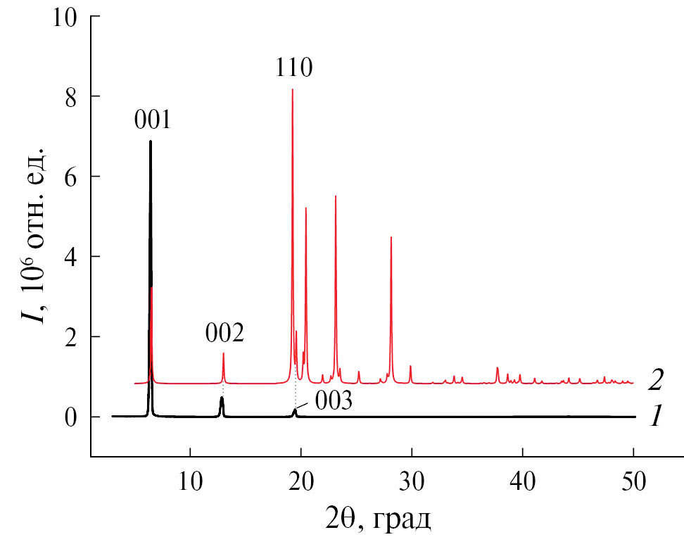 Рентгеновская дифрактограмма монокристаллического образца 3P, снятая при отражении от рабочей поверхности, приведена на рис. 2 (спектр 1). Наиболее интенсивный пик находится при 2θ1 = 6.4°, а положение менее интенсивных второго и третьего дифракционного пиков приблизительно соответствует удвоенному (12.9°) и утроенному (19.5°) значению 2θ1. Сравнение с данными монокристального рентгеноструктурного анализа, представленного на рис. 2 в виде реконструированной порошковой дифрактограммы (спектр 2) [6], показало, что наблюдаемая для монокристаллического элемента 3P дифракционная картина является результатом отражения от семейства плоскостей {00l} с межплоскостным расстоянием d001 = 13.58 Å. В кристалле 3P плоскость (001) является плоскостью спайности с наименьшей поверхностной энергией [18].