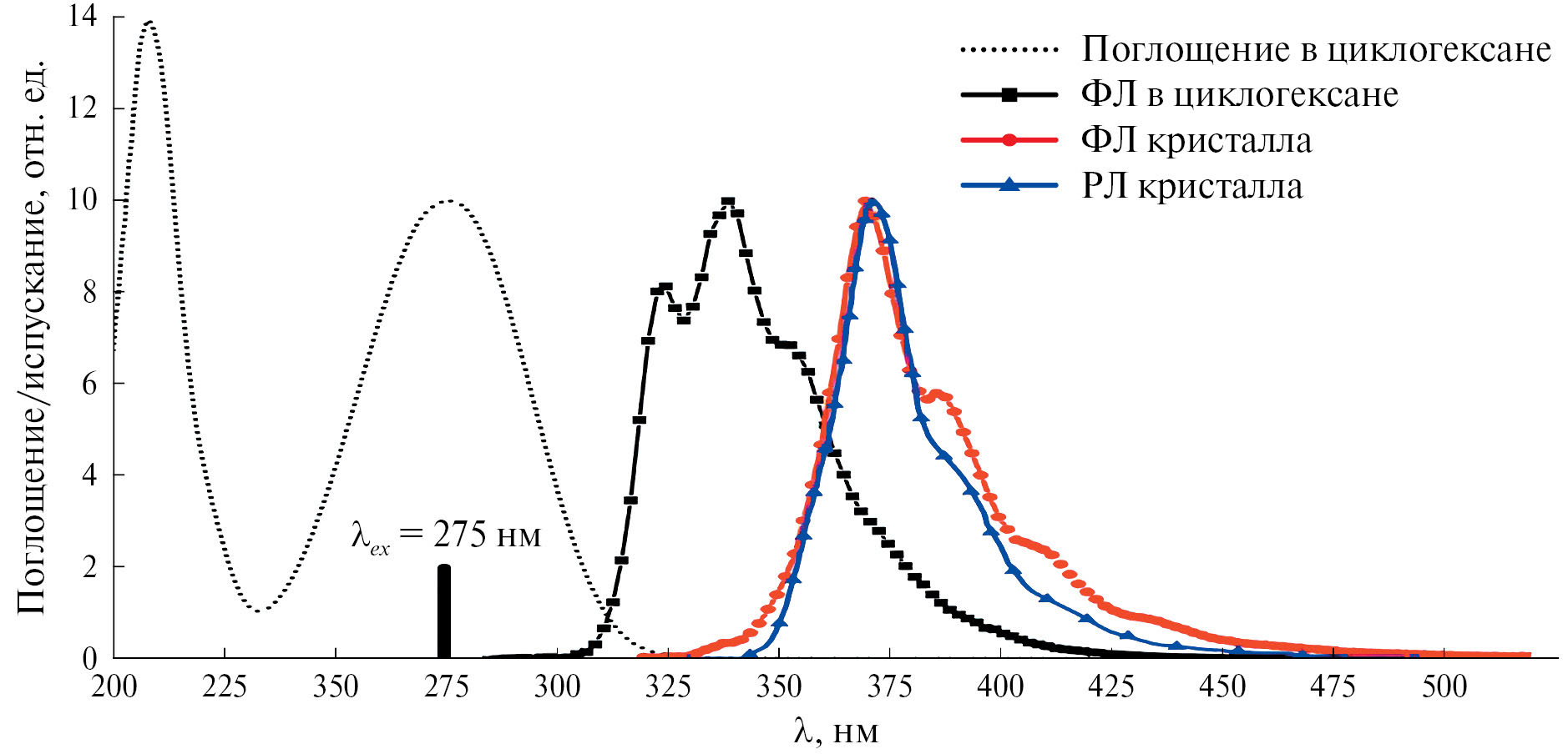 Измерения спектров поглощения, фотолюминесценции и времен жизни фотолюминесценции. Спектры ФЛ и кинетики затухания ФЛ раствора в циклогексане и выращенного из расплава кристалла исследовали с помощью спектрофлуориметра с времякоррелированным счетом фотонов FluoTime 300 (PicoQuant, Германия). Спектры поглощения и пропускания исследовали с помощью спектрофотометра Carry300 (Agilent, США). Возбуждение ФЛ проводилось на длине волны λex = 275 ± 10 нм (импульсный светодиодный источник PLS 270). Оптическая плотность растворов на длине волны возбуждения <0.7. Измерения спектров поглощения, ФЛ и кинетики ФЛ раствора проводили в 3 мл кварцевой кювете 10 × 10 мм при 298 К. Сигнал регистрировали на длинах волн максимумов спектров люминесценции.