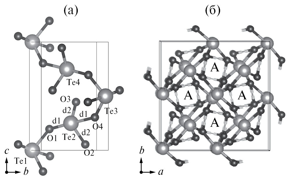 Рис. 1. Кристаллическая структура α-TeO2: в плоскости (bc) (а), в плоскости (ab) (б). О1…О4, Те1…Те4 – номера атомов, d1, d2 – связи Те–О. На рис. (б) буквой А отмечены “квадратные” сквозные каналы, пронизывающие структуру вдоль оси с.