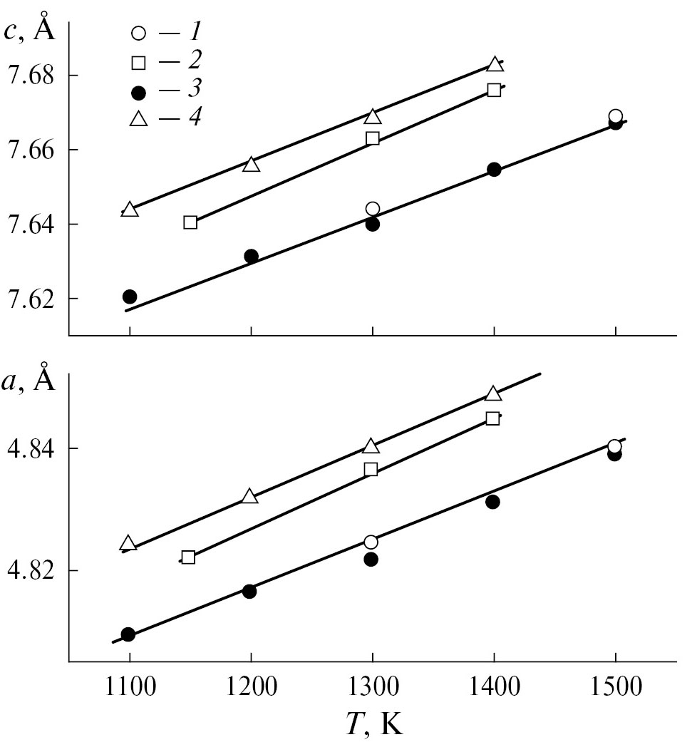 Рис. 5. Параметры решетки TeO2 различной степени дефектности в температурном диапазоне 1100–1500 K: 1 – стехиометрический состав, 2 – пять вакансий кислорода, 3 – 10 междоузельных атомов кислорода, 4 – 15 вакансий кислорода.