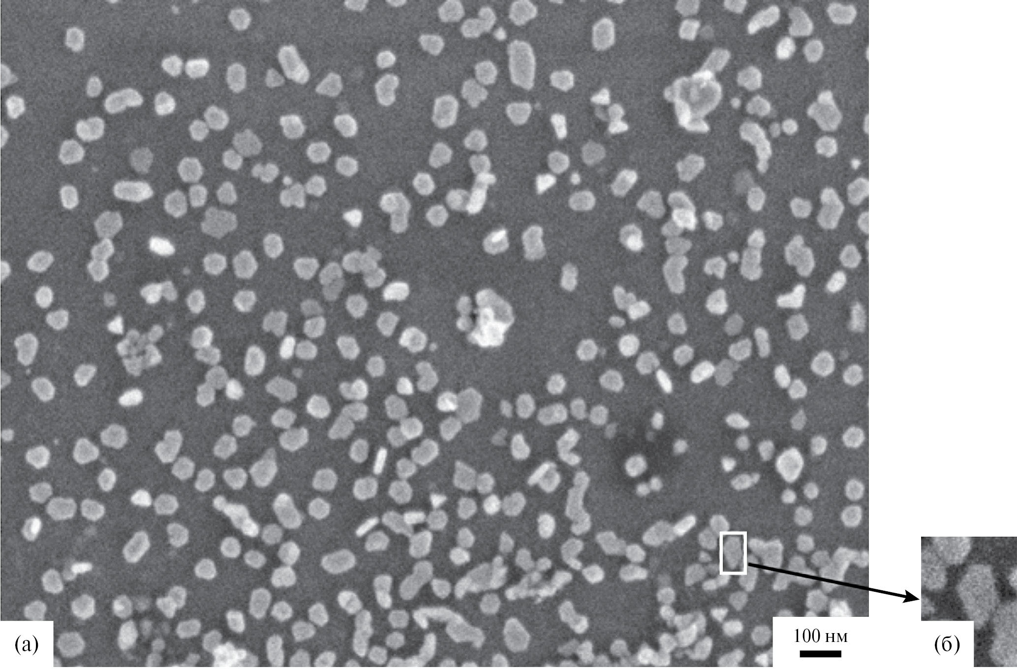 Изображения распределения нано- и микрокристаллов Bi на подложках Si получены методом сканирующей электронной микроскопии (СЭМ) на приборе Jeol JSM 7401F с использованием режима торможения первичного пучка Gentle Beam при ускоряющем напряжении 1 кВ. Представленные СЭМ-измерения наночастиц Bi носят оценочный характер. Это связано с высокой относительной погрешностью, которая может достигать 20% для полученного диапазона размеров кристаллов Bi. Рентгеноструктурный анализ наноструктур Bi проводили на дифрактометре Miniflex 600 (Rigaku, Япония) с использованием CuKα-излучения, λ = 1.54056 Å. Съемку проводили в геометрии Брэгга–Брентано при комнатной температуре. Расшифровку дифрактограмм выполняли с помощью программы HighScore Plus с использованием кристаллографической базы данных ICSD.